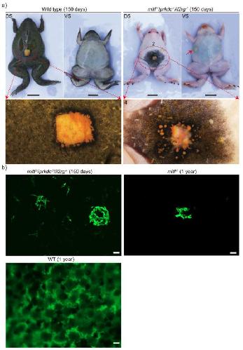 Fig. 8: The mitf/prkdc/il2rg triple-knockout results in the creation of a line of colorless and immunodeficient Xenopus tropicalis.