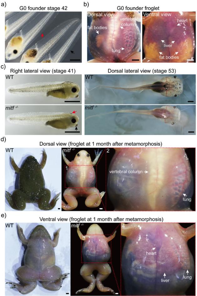 a After using the CRISPR/Cas9 system to knock out mitf via gRNA T7, founder generation (G0) mosaic tadpoles at stage 42 exhibited a loss of melanophores (indicated by red arrow), compared to wild type (WT) tadpoles from the same batch (indicated by black arrow). 79 mosaic tadpoles and 20 wild type tadpoles were observed. b One month after metamorphosis, the transparent skin of the mosaic froglet allowed for external visibility of internal organs such as the fat bodies, lung, liver, heart, and vertebral column. Here was shown one representative froglet, out of a total of 11 mosaic froglets. c The F1 mitf−/− Xenopus tropicalis tadpole exhibited melanophores loss throughout the entire body at stages 41 and 53 compared to wild type tadpoles from the same batch. Notably, at stage 41, the melanin pigmentation in the eyes of mitf−/− Xenopus tropicalis was generated by retinal pigment epithelium (RPE) cells, and redistribution of melanin in oocytes resulted in some melanin pigment in the head (indicated by red arrow) and cement gland (indicated by black arrow). However, the melanin pigment in the head and cement gland disappeared in later development stages, such as stage 53. Representative photographs were exhibited from 35 F1 mitf−/− Xenopus tropicalis tadpoles at stage 41, 15 F1 mitf−/− Xenopus tropicalis tadpoles at stage 53, as well as from 10 wild type tadpoles each at stage 41 and 53. d, e One month after metamorphosis, the F1 mitf−/− Xenopus tropicalis froglet exhibited transparent skin from both dorsal (d) and ventral (e) views. Red dashed boxes 2 and 4 corresponded to magnified views of red dashed boxes 1 and 3, respectively. The transparent skin allowed for external visibility of internal organs including the lung, liver, heart, and vertebral column within one month after metamorphosis as shown. Ten F1 mitf−/− Xenopus tropicalis froglets and ten wild-type Xenopus tropicalis froglets were used to provide representative photographs as shown. Each scale bar is 1 mm.