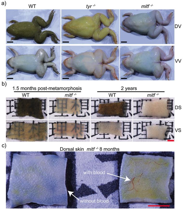 Fig. 2: The skin of mitf−/− adult frogs turns colorless and opaque. a The representative photographs of adult wild type (WT), tyr−/−, and mitf−/− Xenopus tropicalis were displayed to showcase their dorsal view (DV) and ventral view (VV). The photographs were obtained from a sample of 15 adult frogs of each genotype, all of which were 1 year old. b Skin samples approximately 2 mm×5 mm in size were obtained from both dorsal skin (DS) and ventral skin (VS) of wild-type and mitf−/− Xenopus tropicalis aged 2 years or 1.5 months postmetamorphosis. These samples were utilized in transillumination experiments to assess their translucency properties. Specifically, the experiment involved positioning each sample on a sheet of paper with the word “理想“ and photographing them under consistent lighting and camera settings to assess the visibility of the word. Three frogs were used for each genotype, and one sample of DS and VS skin was collected per frog. Representative photographs of each genotype were presented to illustrate the experimental findings. c Skin samples were obtained with blood or after exlusion of blood from dorsal regions of the same mitf−/− Xenopus tropicalis aged 8 months. Three frogs were used for this experiment. The representative photograph was presented. The black scale bar in a is 1 cm. The red scale bar in b and c is 1 mm.