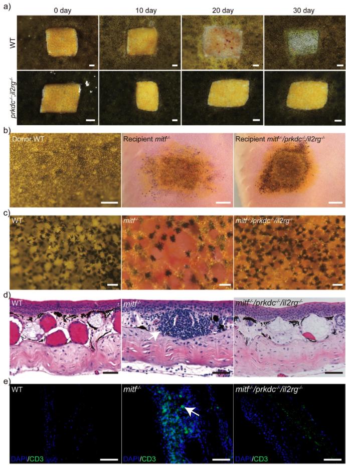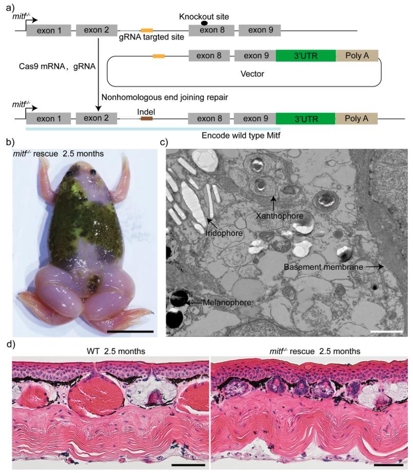 The process revealed the crucial role of mitf in the development of melanophores, xanthophores, and granular glands. The resulting mitf−/−/prkdc−/−/il2rg−/− Xenopus tropicalis is suitable for research on allograft tumor transplantation.