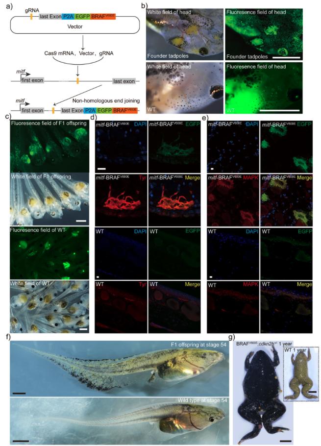 a The strategy of precisely integrating the human BRAFT1799A mutation into the mitf genomic locus through non-homologous end joining repair mediated by CRISPR/Cas9 has been demonstrated. This involves placing the mutation downstream of the last exon of mitf, thereby utilizing the endogenous promoter of mitf to drive BRAFV600E expression. b At stage 56, following precise integration of human BRAFT1799A into the mitf genomic locus, the founder generation tadpoles exhibited a mosaic phenotype characterized by aberrant proliferation of melanophores and xanthophores. Additionally, a significant proliferation of xanthophores was observed using spontaneous green fluorescence. The control group exhibited the absence of this phenotype in WT tadpoles. A total of eight such tadpoles were observed at this stage. c Compared to the control group of WT tadpoles, the F1 generation mitf-BRAFV600E tadpoles at stage 46 were observed and found to exhibit EGFP signals. d, e Immunofluorescence analysis was performed on three tail samples obtained from three stage 56 mitf-BRAFV600E tadpoles from the F1 generation. Every sample was fixed, embedded, and sectioned into six paraffin slices for the analysis. The results demonstrated co-localization of Tyr and EGFP (d), as well as co-localization of EGFP and MAPK signaling pathway activation (e). The WT control group showed an absence of EGFP signals, and cells with activated MAPK pathway were also scarce. The activation of the MAPK signaling pathway was evidenced by positive fluorescence signal of the antibody-ERK1 + ERK2. The images presented here were representative of the observed results. f A typical photograph of F1 mitf-BRAFV600E tadpoles at stage 54 and the corresponding batch of WT tadpoles was presented. g Compared to a 1-year-old WT frog, a representative image of a 1-year-old cdkn2b+/−;mitf-BRAFV600E frog showed spontaneously formed nevi and xanthophoromas. Scale bar in b, 2 mm; Scale bar in c, 1 mm; Scale bar in d and e, 10 μm; Scale bar in f, 5 mm; Scale bar in g, 1 cm.