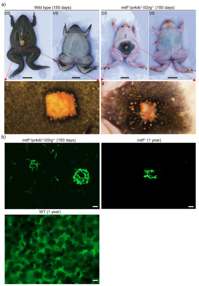 Fig. 9: Allogeneic transplantations of xanthophoromas were conducted in mitf−/−/prkdc−/−/il2rg−/− Xenopus tropicalis, resulting in the observed systemic metastasis of transplanted xanthophoromas in the recipient animals.