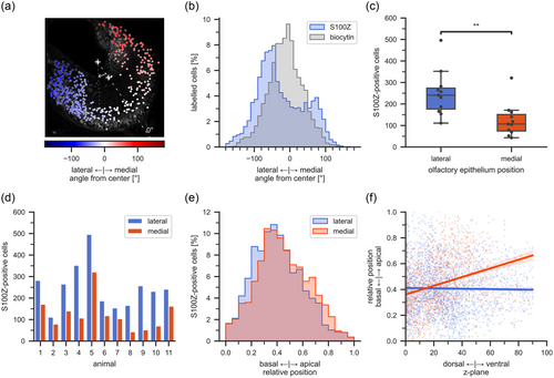 Laterally shifted distribution of S100Z-positive cells. (a) Maximum projection of a larval X. laevis MOE with an overlay of all S100Z-positive cells. The color gradient from blue (lateral) to red (medial) indicates the angular position within the MOE (zero equals the middle of the MOE). Crosses mark the average coordinates of the manually drawn apical and basal MOE boundaries. Angles were determined between each cell position and the vector that defined the middle of the MOE (dashed line). (b) The bimodal distribution of S100Z-positive cells (blue) was shifted toward a lateral position (n = 11 larvae). The general ORN population was labeled via a biocytin backfill and showed a unimodal distribution centered around the middle of the MOE (gray, n = 4 larvae). (c) The mean number of S100Z-positive cells in the lateral MOE was significantly higher than in the medial MOE (n = 11 larvae). KruskalWallis test. **, p < .01. (d) The number of S100Z-positive cells in the lateral MOE was always higher than in the medial MOE in all animals investigated (n = 11 larvae). (e) The relative position within the MOE on the apical-basal axis was not different between the lateral and medial S100Z-positive populations, a tendency toward a more basal position on the lateral side notwithstanding. (f) The medial S100Z-positive population featured a correlation between the position on the ventral-dorsal and basal-apical axis. Cells deeper in the medial MOE were shifted to apical positions. MOE, main olfactory epithelium.