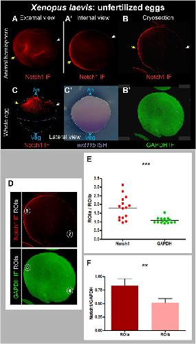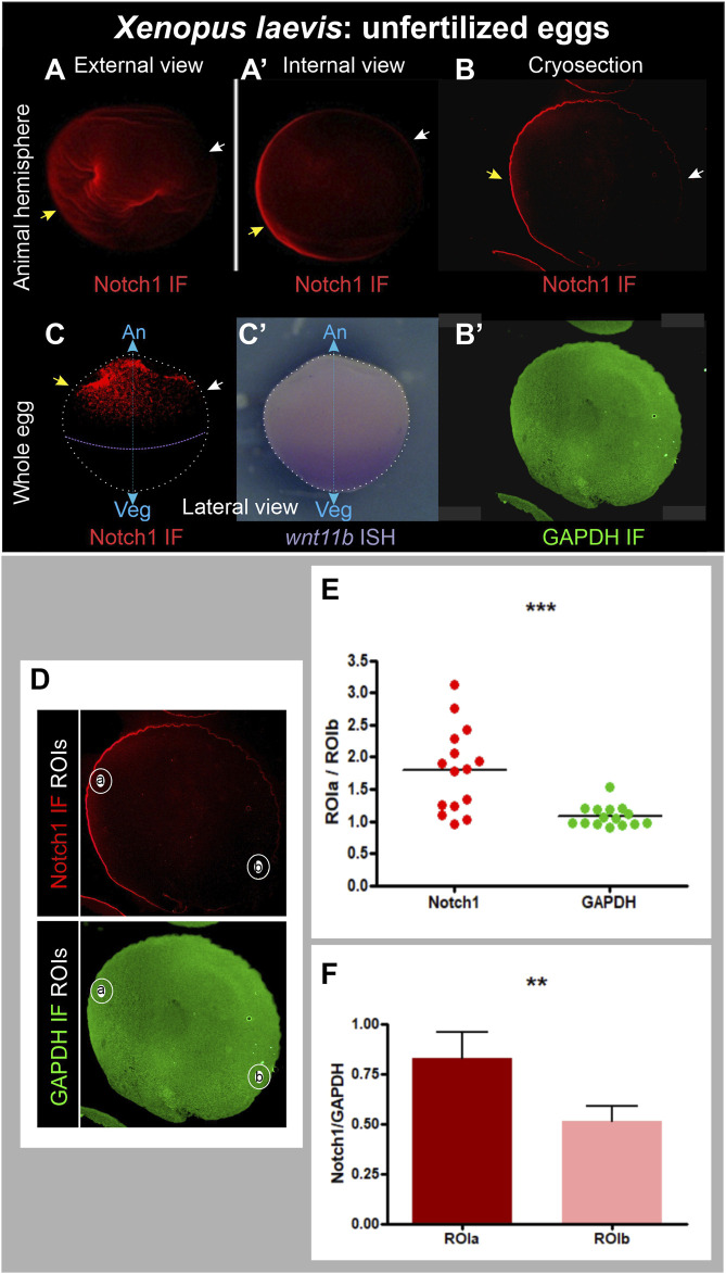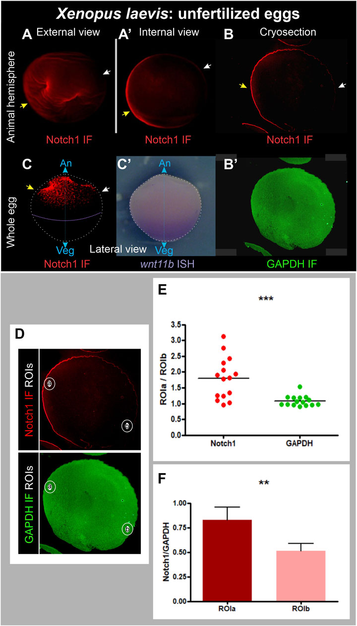 Figure 3. Asymmetric distribution of Notch1 protein in the animal hemisphere of unfertilized Xenopus laevis eggs. (A–B’) Pigmented animal hemispheres were dissected by cutting them away through the equatorial plane, bleached, and directly processed for Notch1 immunofluorescence (A,A’) or cryosections followed by Notch1 immunofluorescence combined with GAPDH immunofluorescence as ubiquitous reference protein (B,B’). (C,C’) Whole albino egg, Notch1 immunofluorescence (C’) combined with wnt11b ISH as reference to verify the orientation of the animal-vegetal axis (C’), since wnt11b mRNA is uniformly distributed in the vegetal region. Yellow and white arrows respectively point to the highest and lowest Notch1 immunofluorescence signal, indicating that Notch1 protein is asymmetrically distributed in the animal hemisphere in unfertilized eggs. An, animal pole; Veg, vegetal pole; IF, immunofluorescence; cyan double arrow, animal-vegetal axis. (D–F) Quantification of Notch1 and GAPDH immunofluorescence in cryosections of animal hemispheres obtained from pigmented, unfertilized eggs, bleached before immunofluorescence. The images shown in (D) are the same as in (B,B’), but here, the selected ROIs are demarcated. (E) Dispersion graph comparing the relative mean pixel intensity (mpi) between ROIa and ROIb for Notch1 and GAPDH immunofluorescence in animal hemisphere cryosections from 15 independent unfertilized eggs. The mean ROIa/ROIb ratio was significantly higher for Notch1 than for GAPDH immunofluorescence, which was close to 1, as expected for a protein of homogeneous distribution (p = 0.0008, two-tailed paired t-test). (F) Comparison of relative Notch1/GAPDH mpi levels between ROIa and ROIb in the same set of eggs shown in (E). The Notch1/GAPDH ratio was significantly higher in ROIa than in ROIb (p = 0.0016, two-tailed paired t-test, n = 15). Since each sample always comprised a pair of measurements (as defined by ROIa and ROIb), paired t-tests (two-tailed) were performed; the difference between means was considered statistically significant when p < 0.05. |