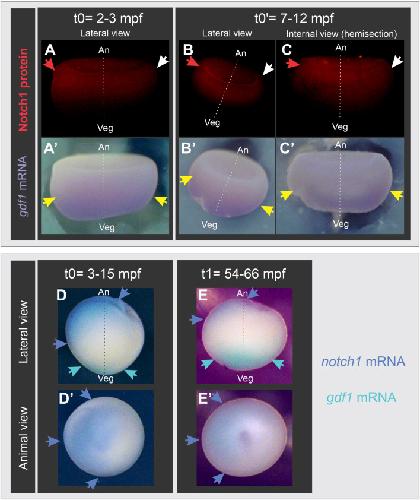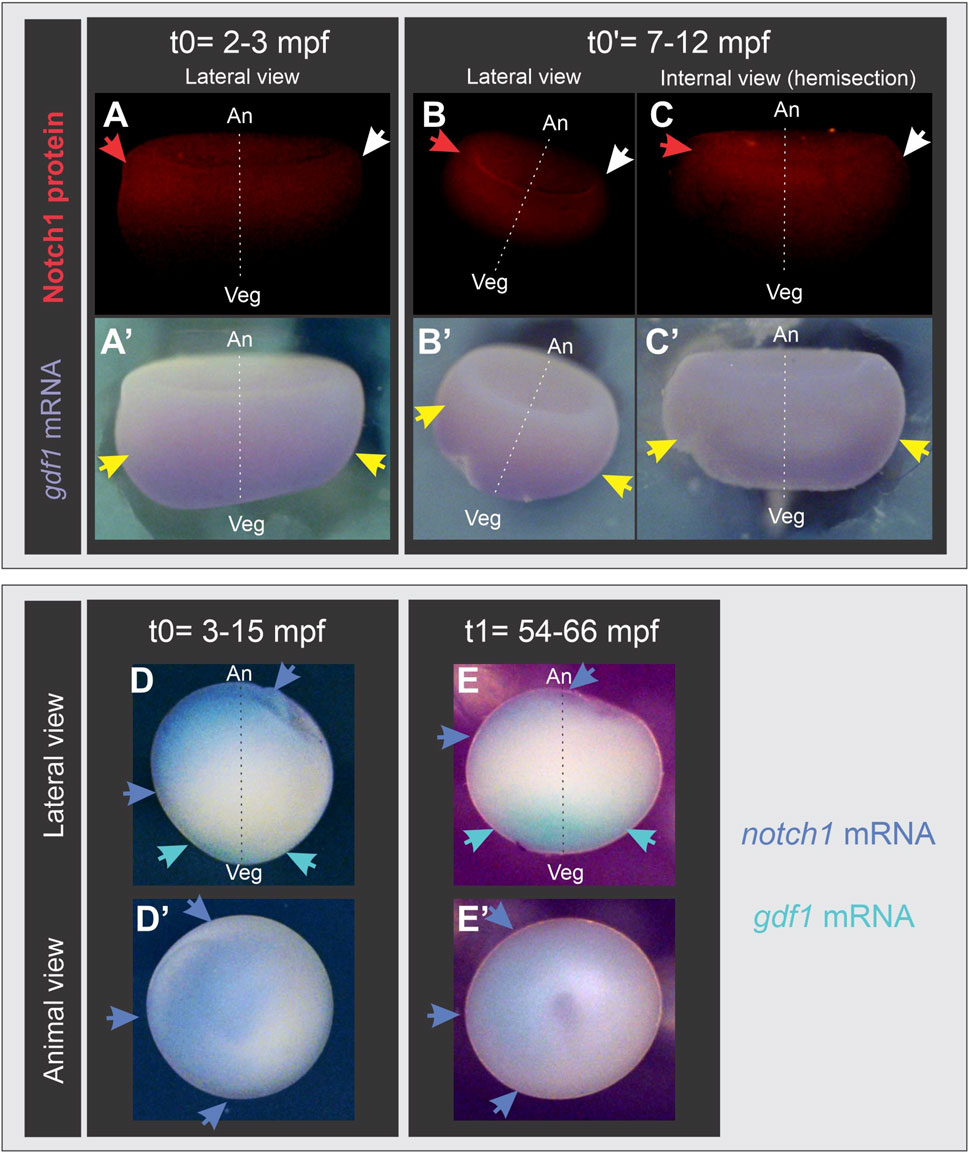 FIGURE 2. Notch1 protein and mRNA are asymmetrically distributed in the animal hemisphere of Xenopus laevis zygotes before the onset of cortical rotation. Albino embryos at s1 fixed before (t0, t0′) or at the end (t1) of cortical rotation; mpf, minutes post-fertilization. (A’–E’) are the same embryos shown in (A–E), respectively. (A–C’) combined Notch1 immunofluorescence (A–C) and gdf1 (vg1) ISH (A’–C’). Red and white arrows respectively point to the highest and lowest immunofluorescence signal, indicating that Notch1 protein is asymmetrically distributed in the animal hemisphere before and after cortical rotation, while gdf1 (vg1) mRNA is uniformly distributed in the vegetal region (yellow arrows), as expected. (D–E’) double ISH for notch1 (blue) and gdf1 (vg1) (turquoise). Blue arrows point to the asymmetric distribution of notch1 mRNA in the animal hemisphere before (D,D’) and at the end of cortical rotation (E,E’). Embryo’s orientation was verified by gdf1 (vg1) mRNA location (turquoise arrows) as reference since it is uniformly distributed in the vegetal cortex. An, animal pole; Veg, vegetal pole; broken line, animal-vegetal axis. |