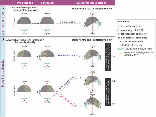 FIGURE 8. (A) Classic model of axis formation in Xenopus, which only considers relocation of maternal dorsal determinants after fertilization. (B) New hypothesis for axis formation in Xenopus, which considers both relocation of maternal dorsal determinants after fertilization and an intrinsic bilaterality of unfertilized eggs harboring an asymmetric distribution of ventralizing molecules in the animal hemisphere. See main text for additional details. |