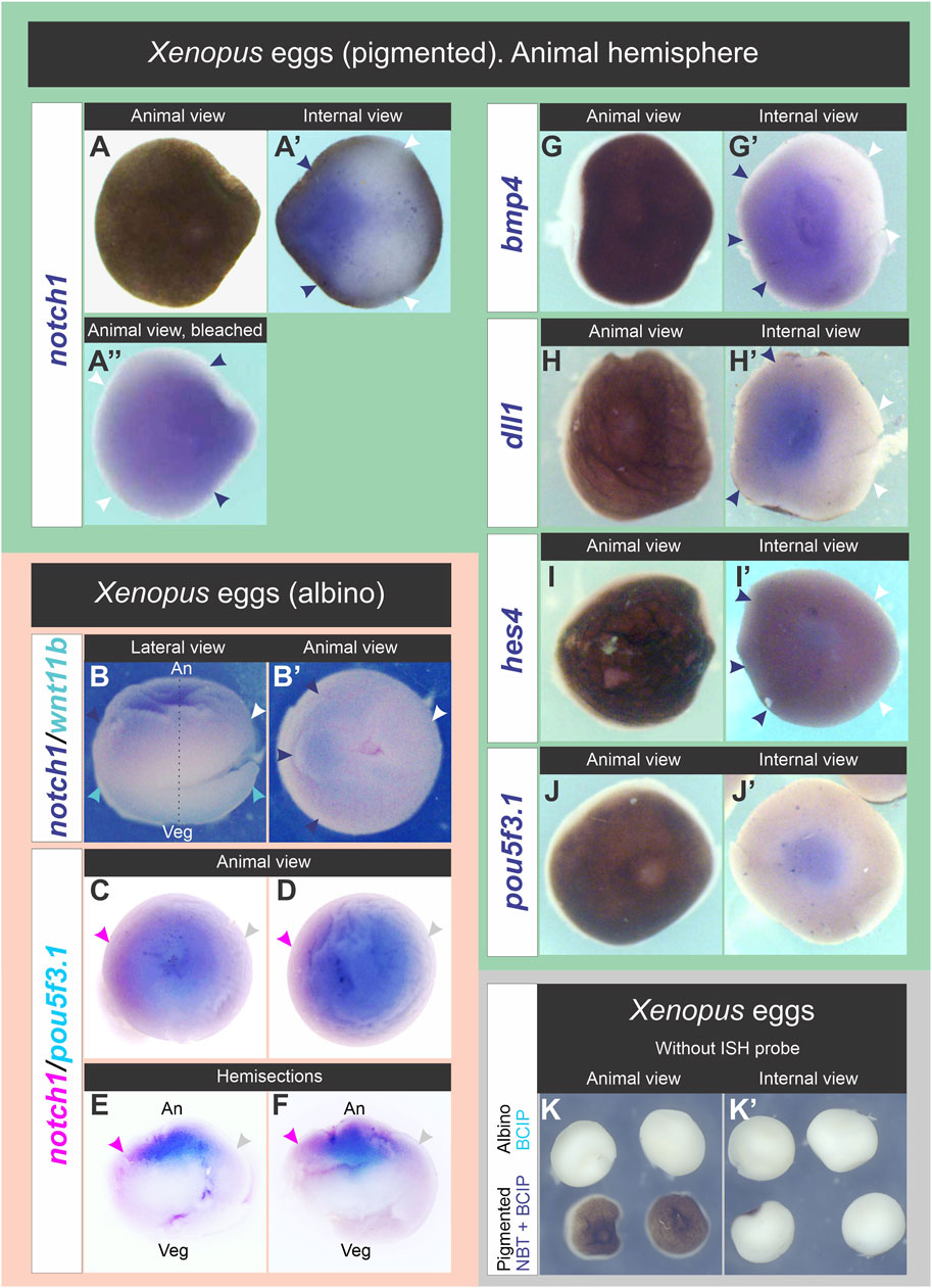 Figure 4. Distribution of notch1 mRNA and other transcripts in the animal hemisphere of unfertilized Xenopus laevis eggs. (A–A”), (G–J′) Pigmented eggs were cut through the equatorial plane. Animal hemispheres were processed for ISH for the following markers: notch1 (A–A”), bmp4 (G,G′), dll1 (H,H′), hes4 (I,I′), and pou5f3.1 (J,J′). Animal hemispheres in (A,G–J) were photographed in animal view, then turned 180° to the right of the observer to photograph their internal side (equatorial face of the animal hemisphere; internal views in (A′,G′-J′). The animal hemisphere processed for notch1 ISH was photographed before (A,A′) and after bleaching (A″) in animal (A,A′) and internal views (A′). (B,B′) Albino egg processed for double ISH for notch1 (blue) and wnt11b (turquoise) shown in lateral (B) and animal views (B′). Dark blue and white arrowheads respectively point to the highest and lowest notch1 ISH signal, indicating that its transcripts are asymmetrically distributed in the animal hemisphere. The egg’s orientation was verified by the location of wnt11b mRNA as reference (turquoise arrowheads), which is uniformly distributed in the vegetal cortex (B). (C–F) Whole albino eggs processed for double ISH for notch1 (magenta) and pou5f3.1 (turquoise). Animal (C,D) and internal views of hemisections cut in the animal-vegetal plane (E,F). Magenta and gray arrowheads respectively point to the highest and lowest notch1 ISH signal, indicating that its transcripts are enriched on one side of the animal hemisphere, while pou5f3.1 does not show such asymmetry. An, animal pole; Veg, vegetal pole; broken line, animal-vegetal axis. Dark blue and white arrowheads in (A′-A″,G′–I′) respectively point to the highest and lowest levels of notch1, bmp4, dll1, and hes4 transcripts in the animal hemisphere. Notice the central location of pou5f3.1 transcripts in the animal hemisphere, most likely related to accumulation in the nuclear region. (K,K′) Absence of non-specific staining in whole albino eggs (upper row) and animal hemispheres from pigmented eggs (lower row) that were processed for ISH but without adding probes, in parallel with albino eggs processed for double ISH (as those shown in B,B′) and revealed with BCIP and with eggs processed for notch1 ISH (as shown in A-A″) and revealed with NBT + BCIP. After the ISH procedure, albino eggs were bisected to show the internal face (K′, upper row). |