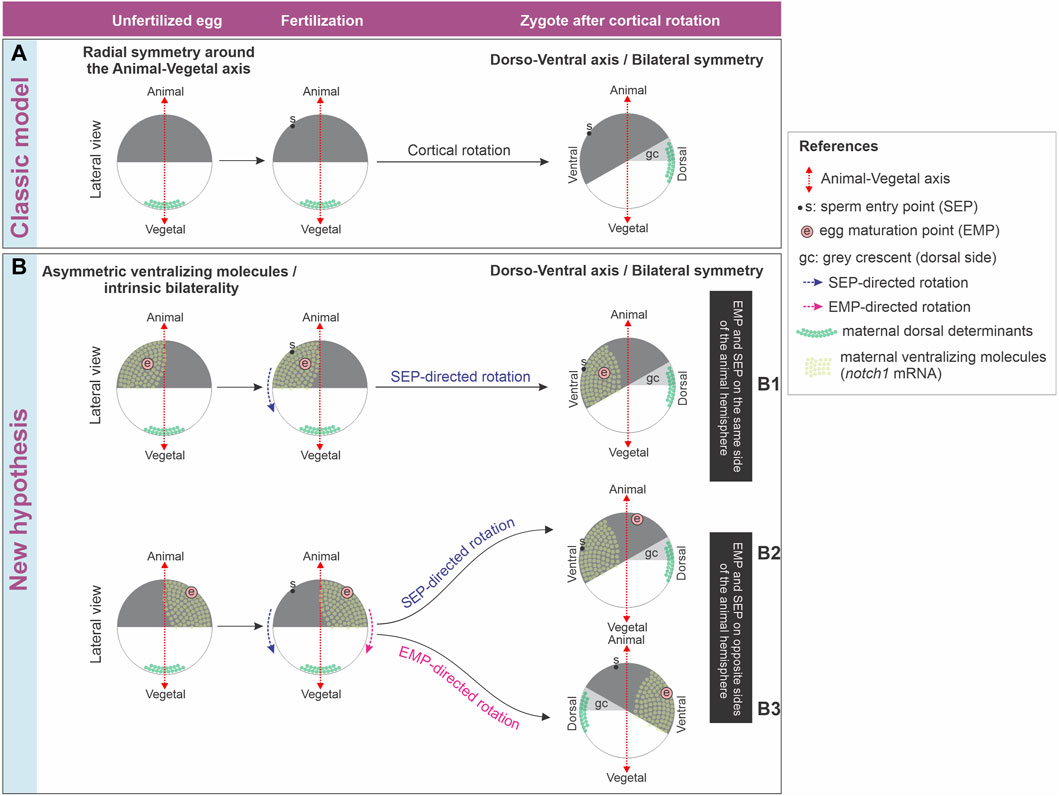 Figure 1. (A) Classic model which considers that the Xenopus unfertilized egg is radially symmetric around the animal-vegetal axis. Radial symmetry is broken shortly after fertilization by cortical rotation through relocation of maternal dorsal determinants from the vegetal pole to the future dorsal side. (B) Xenopus unfertilized eggs bear an intrinsic bilateral symmetry related to the position of the eccentric EMP, which can direct dorsoventral axialization if the SEP-oriented cues fail. Diagram representing the results obtained by Brown et al. (1994) (Brown et al., 1994), who analyzed the direction of yolk mass rotation in eggs with the cortex artificially immobilized, here illustrated as cortical rotation for simplicity. Only in eggs in which the sperm entered the animal hemisphere on the opposite side of the EMP, the later can override the SEP to direct rotation. Global frequencies for either SEP- or EMP- directed rotation were calculated from the results presented on Figure 6 of (Brown et al., 1994) and are shown as percentage of the total number of eggs analyzed (n = 31) in the right column. From the same dataset we also calculated the frequencies for SEP- or EMP- directed rotation for the eggs with the EMP and SEP on the same or on opposite sides of the animal hemisphere (percentages between brackets). |