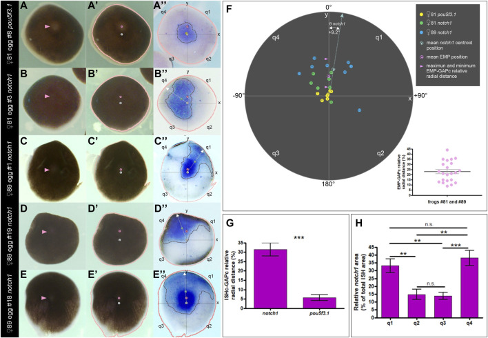 FIGURE 5. Morphometric analysis showing that the distribution of notch1 mRNA is biased towards the EMP side in unfertilized Xenopus laevis eggs. (A–E″) Examples of animal hemispheres obtained from pigmented eggs that were analyzed by morphometry. (A–A″) pou5f3.1 ISH. (B–E″) notch1 ISH in four different animal hemispheres. The first column shows the external, animal views; pink arrowheads point to the EMP. The second column shows the same animal views labeled with the EMP (e, pink circles) and GAPc (g, white circles) locations, and a salmon line corresponding to the egg’s outline drawn by the Analize Particle tools with FIJI. In the third column, these landmarks were overlapped as an overlay to the inverted internal views (equatorial face) showing the ISH domains of the corresponding eggs. Axes and quadrants were labeled as described in the text. Dotted black lines demarcate the ISH ROIs; their centroids are labeled with a yellow circle for pou5f3.1 (p) and a green circle for notch1 (n). The white dotted arrow lines correspond to the radius containing the ISH centroids (ISHc). Eggs in (A–A″,D–D″) are the same as Figure 4F, F′ and A-A″, respectively, but here, their images are oriented for the morphometric analysis and labeled with the landmarks. (F) Polar coordinates graph showing the distribution of ISH centroids for pou5f3.1 and notch1 (color-coded circles, see references in the upper right corner of the figure) for all the analyzed eggs, according to their relative radial distances to the GAPc and their deviation angle from the EMP-GAPc axis (y-axis). Inside the circles, numbers indicate the individual egg# (see Supplementary Table S4 for the corresponding measurements). For notch1 ISH centroids, the mean deviation angle Ө from the EMP-GAPc axis is indicated. The pink circle shows the mean EMP relative radial distance to the GAPc for all analyzed eggs; pink arrowheads show the range of EMP relative positions of the analyzed eggs. Notice that the inferior range limit is the cut-off level assumed for performing the morphometric analysis. The inset in the lower right corner shows a dispersion diagram representing the EMP relative radial distance to the GAPc for all the analyzed eggs. Mean±SEM values are indicated (black and grey lines, respectively). Their spatial distribution is displayed in the polar coordinates graphs of Supplementary Figures S2–S4 and measurements are shown in Supplementary Table S4. See Supplementary Movie S1 showing the transitions between images. (G) ISH centroids for notch1 mRNA are significantly eccentric in relation to the central marker pou5f3.1 (unpaired, two-tailed t-test; p < 0.0001). Bars indicate mean±SEM. (H) Spatial composition of the notch1 ISH domain. Both quadrants on the same side of the EMP (q1, q4) show a significantly higher contribution to the ISH area than the opposite quadrants (q2, q3) in the analyzed eggs (two-tailed, paired t-test; q1,q2: p = 0.0052; q1,q3: p = 0.0083; q1,q4: p = 0.5519; q2,q3: p = 0.7671; q2,q4: p = 0.0089; q3,q4: p = 0.0003); n.s., non-significant differences. Bars indicate mean±SEM. notch1 ISH, n = 15, two independent females; pou5f3.1 ISH, n = 7, one female. |
