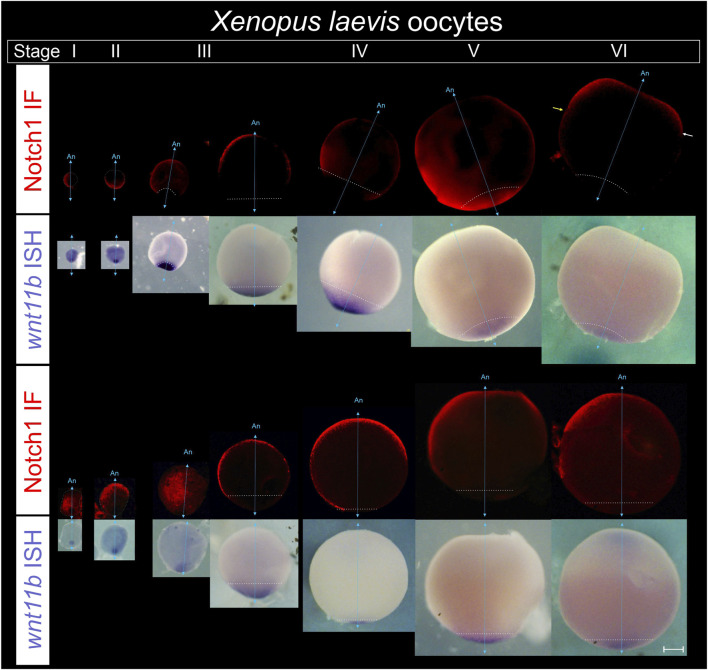 Figure 6. Notch1 protein becomes asymmetrically distributed in an orthogonal axis with respect to the animal-vegetal axis during Xenopus laevis oogenesis. Defolliculated oocytes obtained from pigmented females were fixed, bleached, and processed for combined immunofluorescence for Notch1 protein and ISH for wnt11b mRNA as reference marker of the vegetal pole to orient the oocytes in their animal-vegetal axis. From left to right, successive stages of oogenesis are shown in two representative series. Oocytes were classified according to the stages (s) described by (Dumont, 1972). For each series, the upper tier shows Notch1 immunofluorescence. The same oocytes are shown in bright field in the lower tier, with wnt11b mRNA located in the vegetal pole throughout oogenesis and also on the cytoplasm of early sI oocytes, as previously described (Kloc and Etkin, 1995). An, animal pole; cyan double arrow, animal-vegetal axis, as determined by wnt11b mRNA location; the white dotted line demarcates the contour of sI and sII oocytes and the wnt11b domain from sIII to sVI. Yellow and white arrows on the sVI oocyte point to the vegetal boundary of Notch1 protein expression in the animal hemisphere, which is more vegetal on one side (yellow arrow) than on the other side of the picture (white arrow), thus showing an asymmetric domain in the animal hemisphere. Scale bar: 200 µm. See data in Supplementary Table S5. |