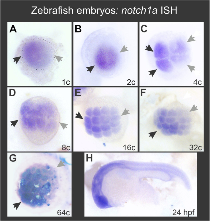 Figure 7. Zebrafish notch1a mRNA is asymmetrically distributed during early embryogenesis in the animal hemisphere from the 1-cell stage. Black and grey arrows in (A–G) respectively point to the regions with the highest and lowest notch1a ISH signal. The dotted ellipse in (A) demarcates the blastodisc. (H) ISH performed in parallel with the same notch1a probe in a 24 hpf embryo, showing typical expression for this transcript. |
