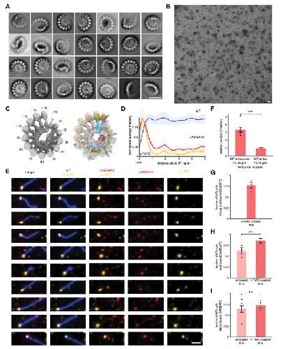 Appendix Figure S8 - Binding of CAMSAP2 to the lattice and γ-TuRC-capped minus ends of MTs nucleated in vitro. A 2D classes obtained from negative stain EM imaging of the recombinant γ-TuRC preparation used for in vitro MT nucleation and CAMSAP2 binding experiments. Scale bar represents 25 nm. B Example negative stain EM micrograph of the recombinant γ-TuRC preparation used for in vitro MT nucleation and CAMSAP2 binding experiments. A small number of exemplary γ-TuRC particles are indicated. Scale bar represents 50 nm. C 3D reconstruction of well-aligning γ-TuRC particles showing 13 stoichiometric and slightly underrepresented spoke 14, likely due to its known conformational plasticity. Subsequent focused classification attempts on spoke 13 and 14 with multiple T-factors revealed no classes indicative of a 11 population of γ-TuRC with 12 or fewer spokes. Atomic model of the recombinant γ-TuRC (PDB 7QJC) is fit. Actin is displayed in red, MZT1 in pink, otherwise, colouring as in Fig. 2B. Spoke numbers are indicated. D Normalised average intensity of CAMSAP2 (red), γ-TuRC (yellow) and MT signals (blue) along the length of γ-TuRC-capped MTs observed by multi-colour fluorescence microscopy (n=65). Curves were normalised to peak at 1. Only MTs longer than 5 μm were considered. Data were combined from three biological replicates. E Gallery of examples illustrating CAMSAP2 (red) colocalising with the γ-TuRC (yellow) and binding to the lattice of in vitro nucleated MTs (blue). Scale bar represents 2 µm. F Average intensity of CAMSAP2 signal within 0.75 μm of the γ-TuRC signal peak (n=795 from 159 MTs, of which 48, 53 and 58 for each respective biological replicate) or further away (n=3068 from 159 MTs). Intensities were normalised to the mean CAMSAP2 intensity on the MT lattice for each biological replicate. p=4.0x10-49. G Fraction of γ-TuRC-capped MTs with CAMSAP2 binding to the minus end (within 1 μm of the MT end; n=159). H Fraction of γ-TuRC-capped MTs and uncapped MTs with CAMSAP2 binding to either end (within 1 μm of the MT end; n=159 in both conditions, p=8.63x10-7 ). I Fraction of γ-TuRC-capped MTs and uncapped MTs with CAMSAP2 binding to the MT lattice (i.e., >1 μm from either MT end; n=159 in both conditions, p=0.05806). Dots in (F), (G), (H) and (I) indicate mean values of the three biological replicates; data are shown as mean with 95% confidence interval for all individual data points. *** p<0.001, n.s. non-significant. Significance determined using a one-tailed Welch’s t-test. Source data is available for this figure. |