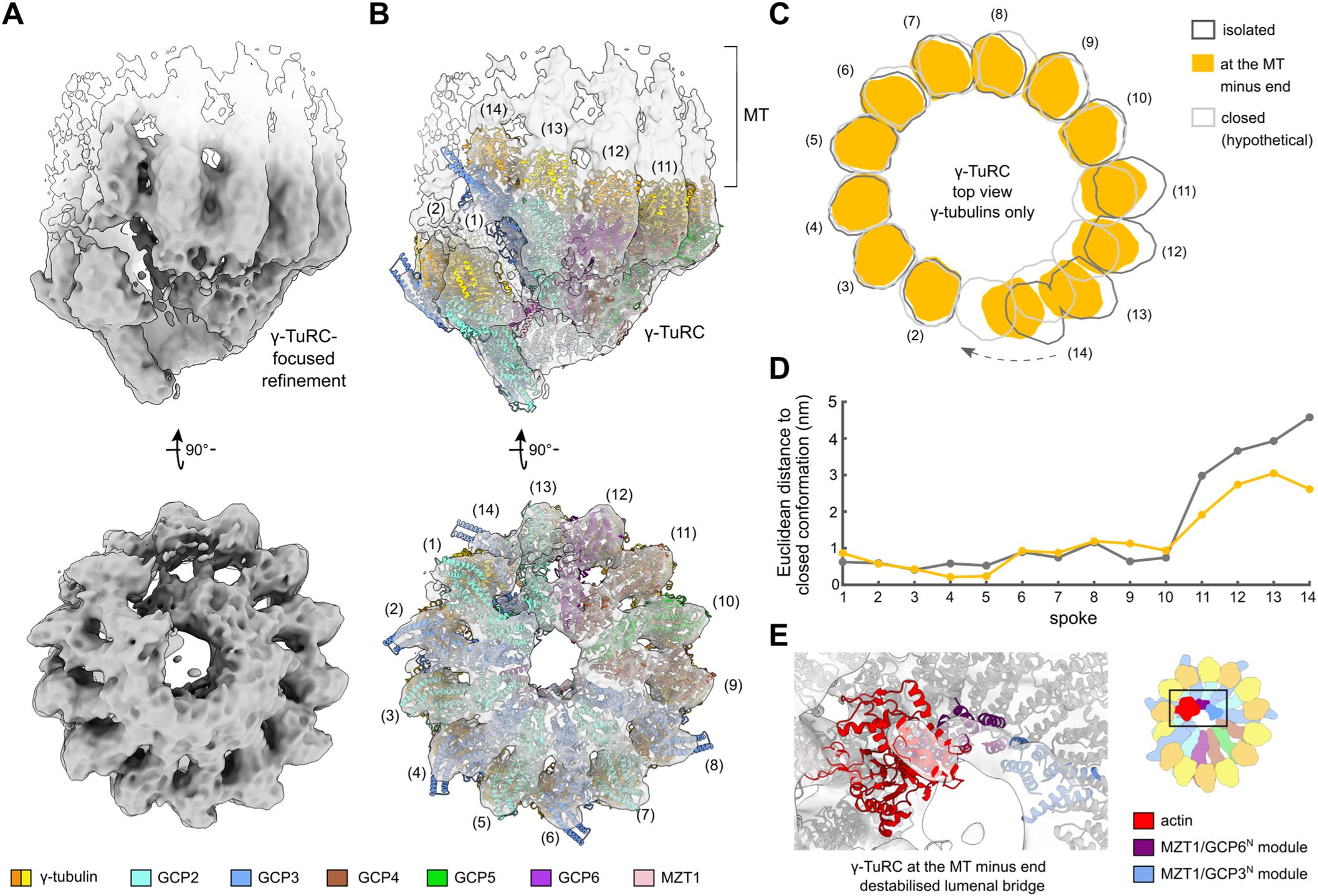 Figure 2. The γ-TuRC assumes a partially closed conformation at the minus end of MTs nucleated through the native RanGTP pathway. (A) Cryo-EM reconstruction of the γ-TuRC at the MT minus end. Density for the MT is shown in white. (B) Spoke-wise rigid-body fit of the atomic model for the Xenopus laevis γ-TuRC (PDB 6TF9) (Liu et al, 2020). Colouring scheme and spoke numbers are indicated. (C) Comparison of the γ-TuRC at the MT minus end with the isolated γ-TuRC (PDB 6TF9) (Liu et al, 2020) and the hypothetical fully closed γ-TuRC, generated based on (EMD 2799) (Kollman et al, 2015). View along the longitudinal axis. Outlines of molecular surfaces are shown for γ-tubulins of spokes 2–14; conformational change from the open to the hypothetical closed γ-TuRC at spoke 14 is indicated by an arrow. (D) Euclidean distance separating γ-tubulin positions in the isolated γ-TuRC (dark grey) or the MT-capping γ-TuRC (orange) from their positions in the hypothetical, fully closed γ-TuRC conformation for each spoke. Distance measured between the centres of mass of γ-tubulins. Colouring as in (C). (E) Zoom-in of the lumenal bridge in the reconstruction of the MT-capping γ-TuRC, superposed with the atomic model of the isolated X. laevis γ-TuRC (PDB 6TF9) (Liu et al, 2020). While the MZT1/GCP6N and MZT1/GCP3N modules of the lumenal bridge are well resolved, density for actin is reduced. Colouring as indicated; components outside the lumenal bridge are shown in grey. Source data are available online for this figure. |