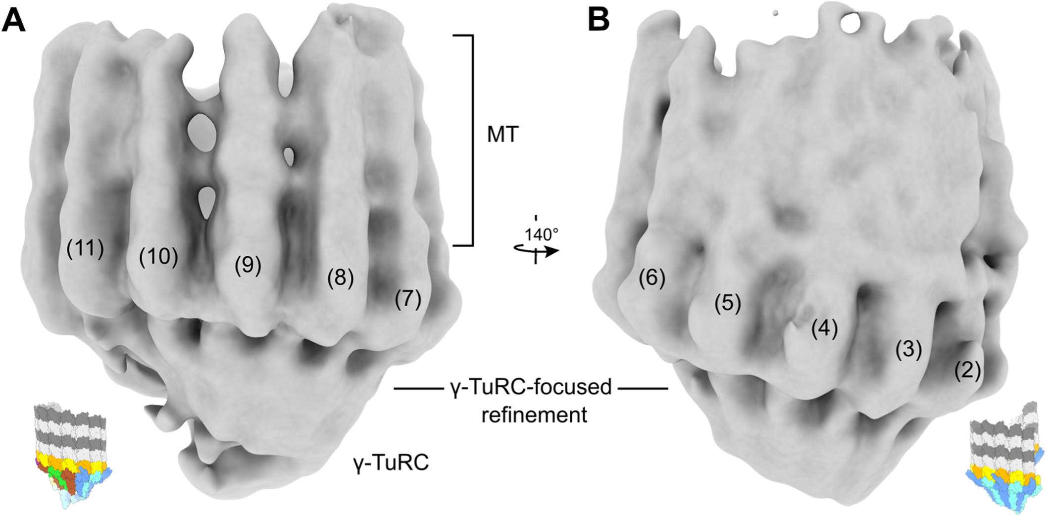 Figure EV4. Not all MT protofilaments are equally rigid with respect to the γ-TuRC. (A, B) Refinement focused on the γ-TuRC, in which all γ-TuRC spokes are well-defined, indicating that the γ-TuRC was well-aligned all around. In contrast, the MT density shows local variations in definition: protofilaments associated with spokes 7–11 of the γ-TuRC (A) are considerably better defined than those associated with spokes 2–5 (B). This indicates increased conformational plasticity of the MT relative to the γ-TuRC at the symmetric side of the γ-TuRC. Reconstructions are local resolution-filtered, shown at low threshold to emphasise MT density. Spoke numbers are indicated. Inset schematics show the orientation of the γ-TuRC. |