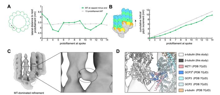 Appendix Figure S5 - Extended analysis of the minus end of capped MTs. A Quantification of the lateral distance between the first α-tubulin in the protofilament at spoke N to the first α-tubulin in the protofilament at spoke N+1. B Quantification of the helical pitch increment for the protofilament at spoke N compared to the protofilament at spoke 2. Colouring as in panel (A). All parameters were calculated using the center of mass of the α-tubulin molecule closest to the γ-TuRC, with schematics illustrating the plotted parameter. C Zoom-in on the density connecting the protofilament at spoke 2 with spoke 1 and 14 (highlighted by dashed circle) in the MT-dominated reconstruction of the γ-TuRC-capped MT. Spoke numbering is indicated. D The model of the γ-TuRC-capped MT generated in this study (white and dark grey) as well as spokes 13 and 14 with the terminal MZT1/GCP3N module of the human recombinant γ-TuRC (PDB 7QJD (Wurtz et al, 2022)) superposed to the reconstruction shown in panel (C). Spokes 13, 14 and the MZT1/GCP3N module were docked as a rigid body. Colouring scheme indicated. Source data is available for this figure. |