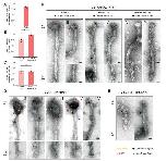 Appendix Figure S7 - Binding of CAMSAP2 to the lattice and γ-TuRC-capped minus ends of MTs nucleated through the RanGTP pathway in X. laevis egg extract. A Fraction of γ-TuRC-capped MTs with CAMSAP2 binding to the minus end observed by multi-colour fluorescence microscopy (within 1 μm of the MT end; n=69, three biological replicates). Example fluorescence microscopy images are shown in Figure 4A. B Fraction of γ-TuRC-capped MTs and uncapped MTs with CAMSAP2 binding to either end observed by multi-colour fluorescence microscopy (within 1 μm of the MT end; n=69 for capped MTs, n=60 for uncapped MTs, p=0.000418, three biological replicates). C Fraction of γ-TuRC-capped MTs and uncapped MTs with CAMSAP2 binding to the MT lattice observed by multi-colour fluorescence microscopy (i.e., >1 μm from either MT end; n=69 for capped MTs, n=60 for uncapped MTs, p=0.3181). Dots in (A), (B) and (C) indicate mean values of the three biological replicates; data are shown as mean with 95% confidence interval for all individual data points. *** p<0.001, n.s. non-significant. Significance determined using a one-tailed Welch’s t-test. D, E Immunogold labelling of γ-TuRC-capped MTs isolated from X. laevis egg extract incubated with GFP-CAMSAP2. GFP-CAMSAP2 and γ-tubulin both localise to the same end of γ-TuRC-capped MTs, which is not observed in samples where GFP-CAMSAP2 is absent (E). Red (CAMSAP2) and yellow (γ-TuRC) asterisks indicate gold beads at the MT minus end. Additional density at MT ends may be attributed to staining of antibodies as well as potential accumulation of condensates of CAMSAP2 (Imasaki et al, 2022). 9 F γ-TuRC-capped MT minus ends isolated from X. laevis egg extract were incubated with GFPCAMSAP2 and labelled with single gold conjugate: anti-GFP antibody labelled with 10 nm Protein A gold conjugated to rabbit anti-goat antibody (left), anti-γ-tubulin antibody labelled with rabbit antimouse antibody that was subsequently labelled with 15 nm Protein A gold (middle) and labelling of only rabbit anti-mouse antibody with 15 nm Protein A gold (right). Red (CAMSAP2) and yellow (γTuRC) asterisks indicate gold beads at the MT minus end. Dots in legend indicate approximate observed size of respective gold beads. Scale bar in (D), (E) and (F) represents 25 nm. Source data is available for this figure. |