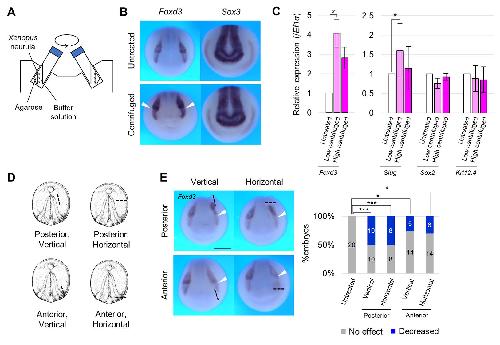 (A) Schematic figure showing centrifugation of embryos. Xenopus embryos were centrifuged with fixed angle rotor in an agarose-coated 50 mL tube from the early neurula stage (st. 13) to the mid-neurula stage (st. 15). How to collect embryos after centrifugation is described in Material and Methods. (B) Expression pattern of Foxd3 and Sox3 in centrifuged embryos at the mid-neurula stage (st. 15). White arrowheads indicate enhanced Foxd3-expression. Scale bar, 500 μm. (C) Expression level (RT-qPCR) of Foxd3, Slug, Sox2, Krt12.4 in centrifuged embryos (low centrifugation, 200 × g; high, 450 × g) at the mid-neurula stage (st. 15). Expression level of Ef1α was used as an internal control. Replicates of the experiment: 3 (Foxd3, Slug, Sox2, Krt12.4 (Low)), 6 (Foxd3, Slug (High)), 4 (Sox2 (High)), 3 (Krt12.4 (High)) (> 5 embryos were used for each replicate). Statistical significance was analyzed with Student t-test, adjusted by Holm method. * p < 0.05. (D) Schematic figure showing the cutting site of embryos. Ectoderm was cut to ~1/4 of the embryo diameter. Black dashed lines indicate the cutting site. (E) Expression pattern of Foxd3 in embryos with cut tissue at the mid-neurula stage (st. 15). A black dashed line indicates the cutting site. A white arrowhead indicates reduced expression. Scale bar, 500 μm. The ratio of phenotypes is summarized in stacked bar graphs. Numbers in the graph indicates numbers of embryos with each phenotype. Statistical significance was analyzed with Fisher’s exact test, adjusted by Holm method. * p < 0.05. *** p < 0.001.