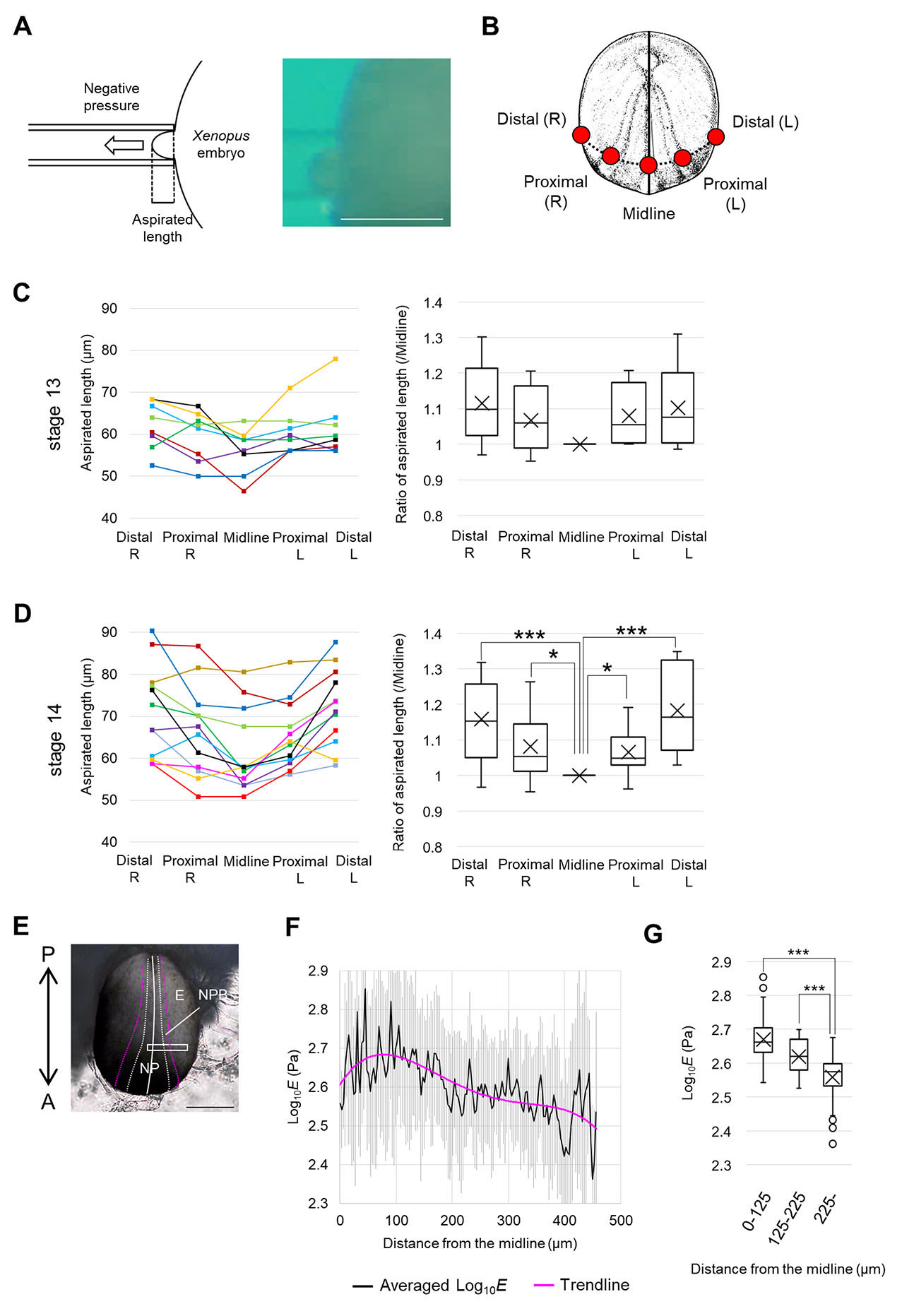 (A) Schematic figure of an aspirated Xenopus embryo and the bright field image. Scale bar, 500 μm. (B) Black line indicates the midline of embryo, and black dashed line indicates the antero-posterior coordinate of aspirated positions. Red circles indicate aspirated positions: Midline, both sides of Proximal and Distal (see Materials and Methods for details). (C) Result of the aspiration assay at the early neurula stage (st. 13). Length of aspirated tissue is shown in the left graph. Each line indicates actual length of aspirated tissue in each measurement (n = 8). Length ratio normalized by each aspirated length of Midline was shown in the right graph (boxplot: The horizontal line indicates the median. Edges of boxes indicate the first and third quartiles. The cross indicates the mean, and whiskers indicate the minimum and maximum). Statistical significance was analyzed with paired t-test, adjusted by Holm method. * p < 0.05. (D) Result of the aspiration assay at the early neurula stage (st. 14). Length of aspirated tissue is shown in the left graph. Each line indicates the actual length of aspirated tissue in each measurement (n = 12). The length ratio normalized by each aspirated length of Midline is shown in the right graph (boxplot). Statistical significance was analyzed with a paired t-test, adjusted by Holm method. * p < 0.05. ** p < 0.01. (E) Bright field image of an embryo measured with AFM at the early neurula stage (st. 13). The white line indicates the midline of the embryo. The white dashed line indicates the boundary between NP and NPB. The magenta dashed line indicates the boundary between NPB and epidermis. A white box indicates the region measured with AFM. A, anterior side, P, posterior side, E, the epidermis. Scale bar, 500 μm. (F) Statistical analysis of AFM measurement. Young’s modulus (log10E) on each lateral coordinate (distance from the midline) was averaged (n = 4 embryos, each data is shown in Fig. S2). Gray lines indicate standard deviations. The magenta line indicates a trendline for a quartic polynomial. (G) Each value (averaged Log10E) in F was categorized into three regions according to the distance from the midline (0-125 μm, 126-225 μm, 226-459 μm), and shown in a boxplot. n = 42 data points (0-125 μm), 34 data points (126-225 μm), 77 data points (226-459 μm). Statistical significance was analyzed with Welch’s t-test, adjusted by Holm method. ** p < 0.01. *** p < 0.001.