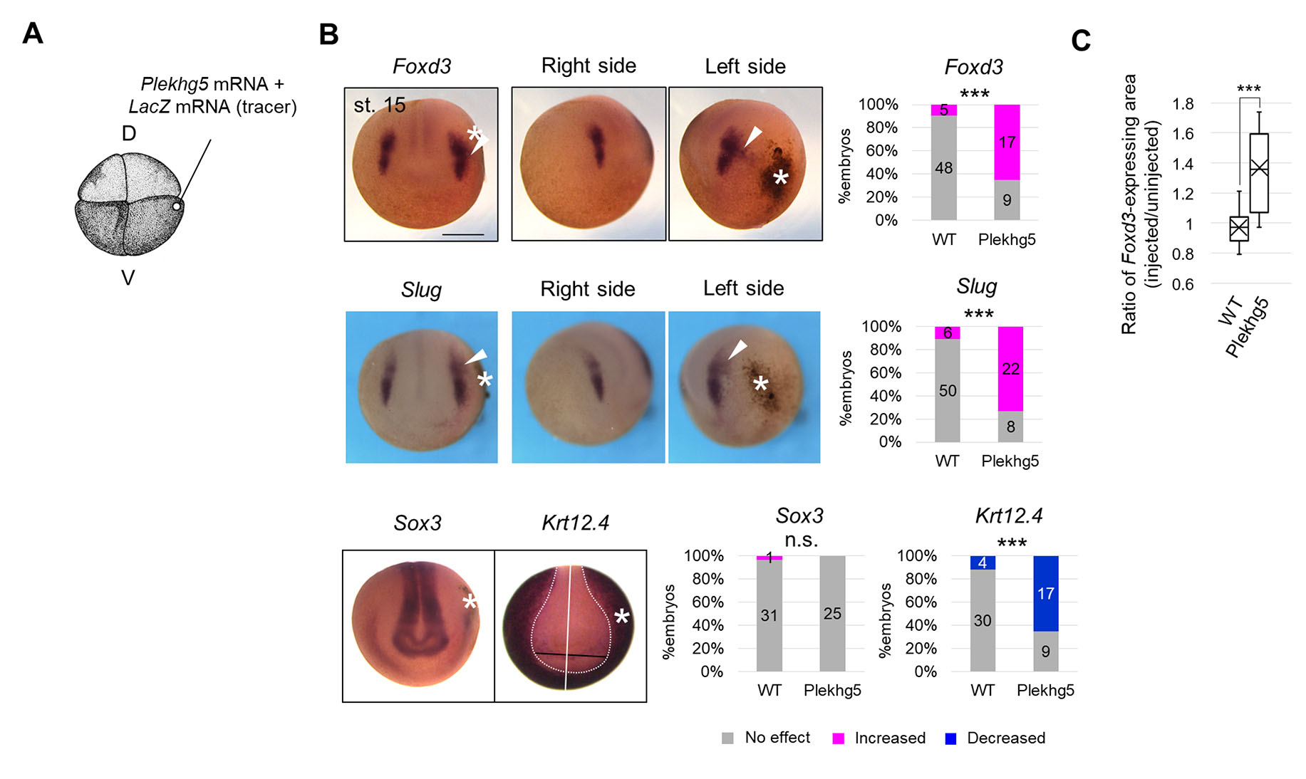 (A) Schematic figure of Plekhg5 mRNA microinjection. D, dorsal blastomere, V, ventral blastomere. 200 pg Plekhg5 mRNA and LacZ mRNA (tracer) were injected into a ventral blastomere at the 4-8-cell stage. (B) Expression pattern of Foxd3 and Slug, Sox3, and Krt12.4 in Plekhg5-expressing embryos at the mid-neurula stage (st. 15). Asterisks indicate ectopic cell contraction induced by Plekhg5. White arrowheads indicate expanded regions of Slug or Foxd3 expression. A white line indicates the midline of the embryo, and a white dashed line indicates the boundary of the Krt12.4-expressing region. A black line indicates the distance from the midline, showing a reduced Krt12.4-expressing region on the injected side. Scale bar, 500 μm. The ratio of phenotypes is summarized in stacked bar graphs. Numbers in the graph indicate numbers of embryos with each phenotype. Statistical significance was analyzed with Fisher’s exact test. *** p < 0.001. (C) Quantification of the area of the Foxd3-expressing region in Plekhg5-expressing embryos at the mid-neurula stage (st. 15) is shown in a boxplot (The horizontal line indicates the median. Edges of boxes indicate the first and third quartiles. The cross indicates the mean, and whiskers indicate the minimum and maximum). Measured samples are shown in Fig. S4F. n = 15 each. Statistical significance was analyzed with Student t-test. *** p < 0.001.
