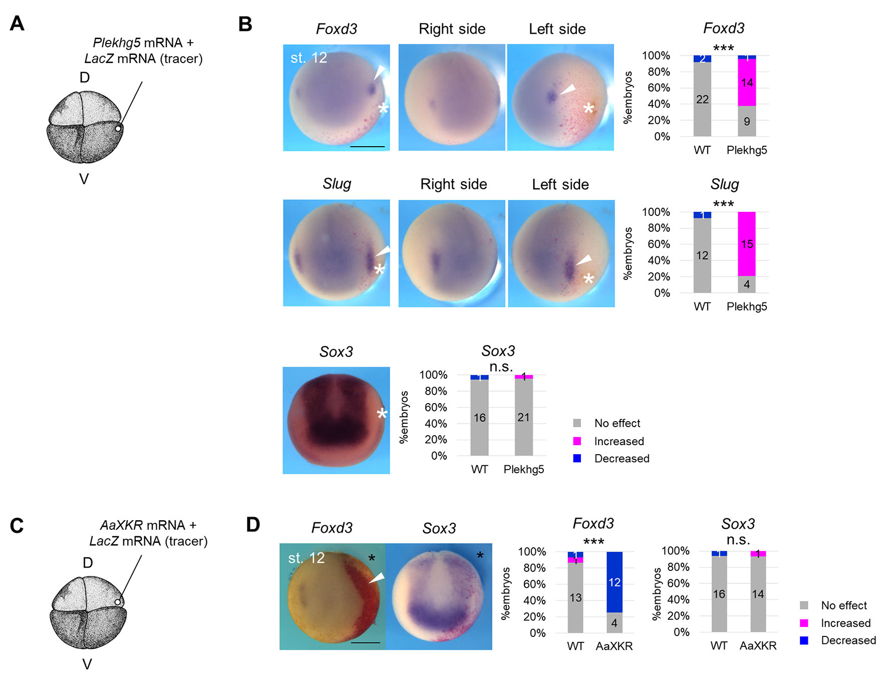 (A) Schematic figure of Plekhg5 mRNA microinjection. D, dorsal blastomere, V, ventral blastomere. 200 pg Plekhg5 mRNA and LacZ mRNA (tracer) were injected into a ventral blastomere at the 4-8-cell stage. (B) Expression pattern of Foxd3 and Slug, Sox3 in Plekhg5-expressing embryos at the late gastrula stage (st. 12). Asterisks indicate ectopic cell contraction induced by Plekhg5. White arrowheads indicate expanded regions of Slug or Foxd3 expression. Scale bar, 500 μm. The ratio of phenotypes is summarized in stacked bar graphs. Numbers in the graph indicate numbers of embryos with each phenotype. Statistical significance was analyzed with Fisher’s exact test. *** p < 0.001. (C) Schematic figure of AaXKR mRNA microinjection. D, dorsal blastomere, V, ventral blastomere. A solution of 400 pg AaXKR mRNA with LacZ mRNA (tracer) was injected at the 4- or 8-cell stage. (D) Expression pattern of Foxd3, Sox3 in AaXKR-expressing embryos at the late gastrula stage (st. 12). Asterisks indicate the injected side. White arrowheads indicate the shrunken region of expression of Foxd3. Scale bar, 500 μm. Ratios of phenotypes are summarized in stacked bar graphs. Numbers in the graph indicate numbers of embryos with each phenotype. Statistical significance was analyzed with Fisher’s exact test. *** p < 0.001.