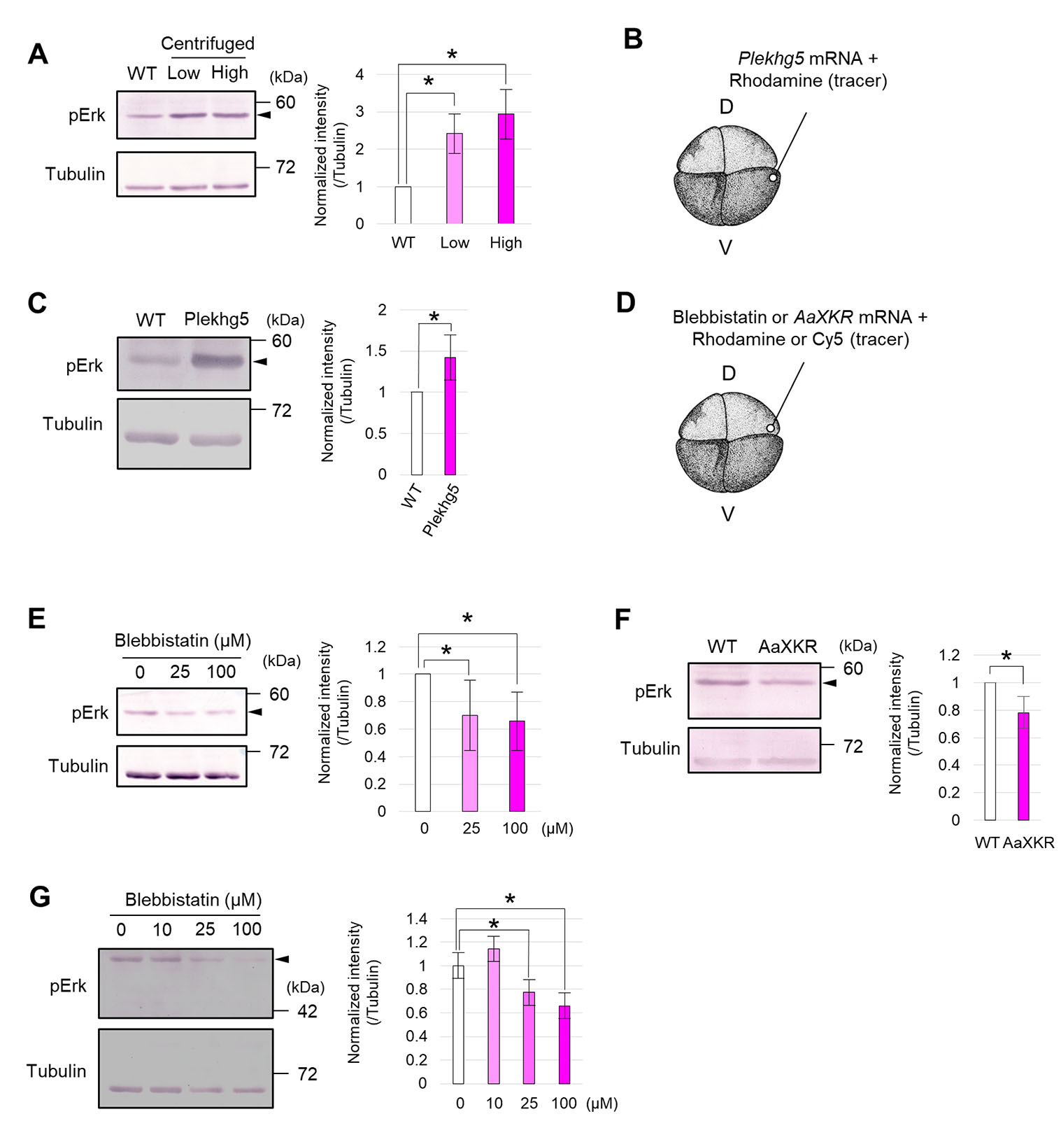 (A) Western blot analysis of phosphorylated Erk (pErk) in centrifuged embryos (low centrifugation, 200 × g; high, 450 × g) at the mid-neurula stage (st. 15). Tubulin was used as an internal control. An arrowhead indicates pErk. Intensity ratio (normalized intensity, normalized against the Tubulin signal) is shown in bar graphs. Replicates of the experiment: 3 (> 5 embryos were used for each replicate). Statistical significance was analyzed with paired t-test, adjusted by Holm method. * p < 0.05. (B) Schematic figure of Blebbistatin or AaXKR mRNA microinjection. D, dorsal blastomere, V, ventral blastomere. A 5 nL solution of Blebbistatin (0 (DMSO), 25, 100 μM) or 400 pg AaXKR mRNA, with Rhodamine-dextran or Cy5 (tracer), was injected into a dorsal blastomere at the 4-8-cell stage. (C) Western blot analysis of pErk in Blebbistatin-injected embryos at the mid-neurula stage (st. 15). Tubulin was used as an internal control. An arrowhead indicates pErk. Intensity ratio normalized against the Tubulin signal (normalized intensity) is shown in bar graphs. Replicates of the experiment: 7 (> 5 embryos were used for each replicate). Statistical significance was analyzed with paired t-test, adjusted by Holm method. * p < 0.05. (D) Western blot analysis of pErk in AaXKR-expressing embryos at the mid-neurula stage (st. 15). Tubulin was used as an internal control. An arrowhead indicates pErk. The intensity ratio normalized against the Tubulin signal (normalized intensity) is shown as bar graphs. Replicates of the experiment: 5 (> 5 embryos were used for each replicate). Statistical significance was analyzed with a paired t-test. * p < 0.05. (E) Western blot analysis of pErk in embryos incubated in medium containing Blebbistatin at the mid-neurula stage (st. 15). Tubulin was used as an internal control. An arrowhead indicates pErk. Intensity ratio normalized against the Tubulin signal (normalized intensity) is shown in bar graphs. Replicates of the experiment: 3 (> 5 embryos were used for each replicate). Statistical significance was analyzed with paired t-test, adjusted by Holm method. * p < 0.05.