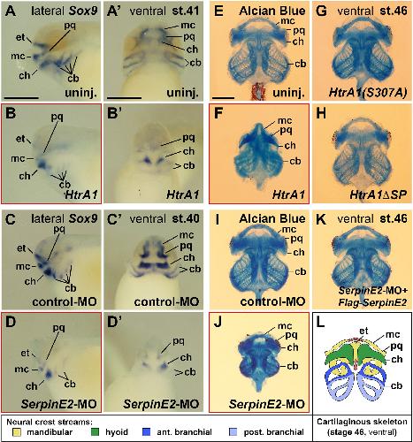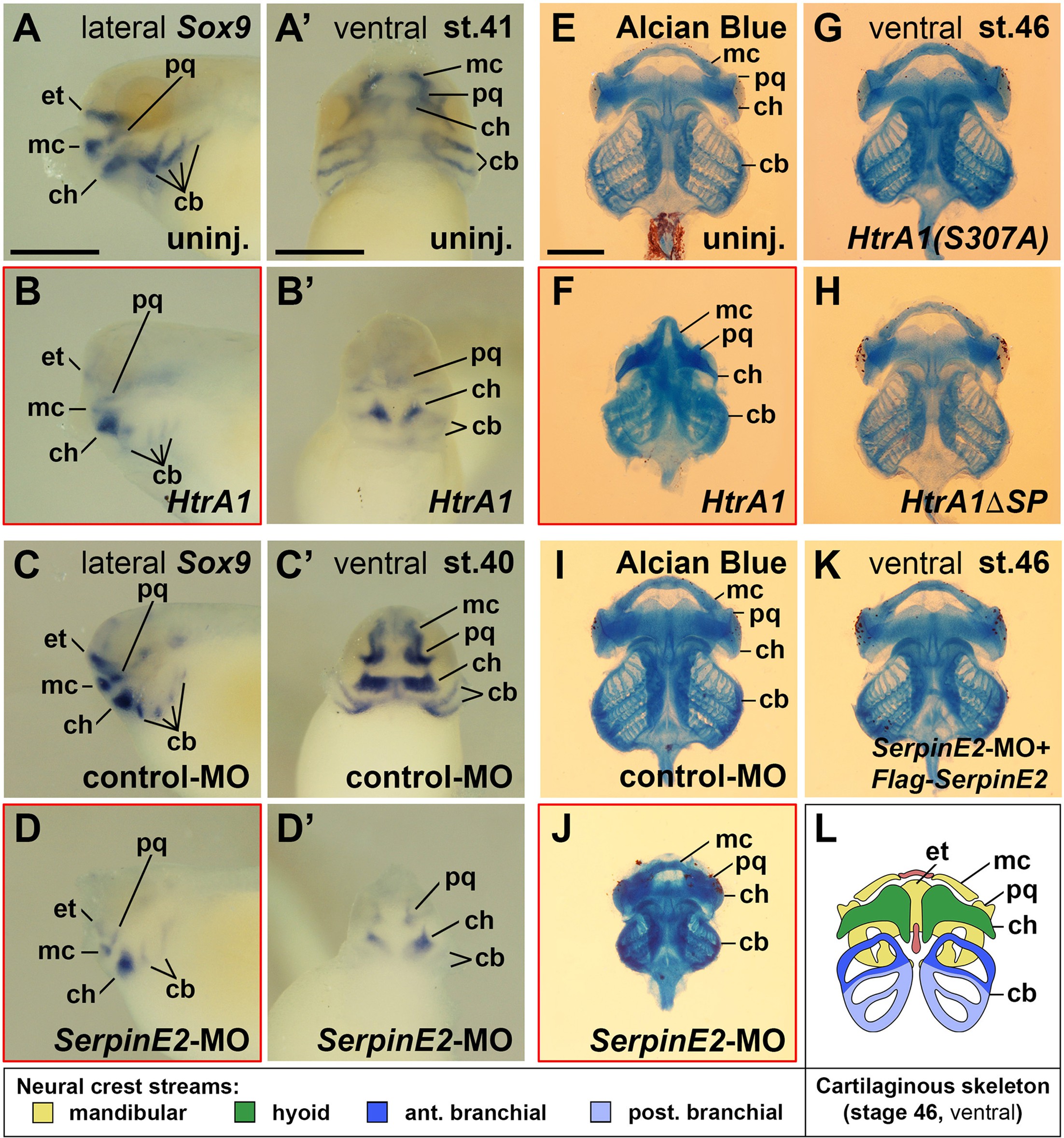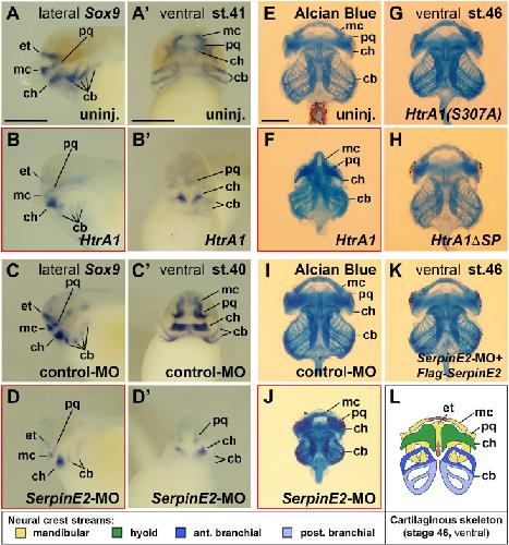 Figure 4. HtrA1 overexpression and SerpinE2 knockdown decrease cartilaginous elements and craniofacial structures.Xenopus embryos were injected into four animal blastomeres at the eight-cell stage with a total of 100 pg mRNA and 40 ng morpholino oligonucleotides (MOs). (A–D’) Tadpoles at stages 40/41 after whole-mount in situ hybridization in lateral (A–D) and ventral view (A’–D’). Note that HtrA1 mRNA and SerpinE2-MO reduce Sox9 expression, whereas control-MO has no effect on the labeled cartilaginous elements. (E–K) Ventral view of cartilaginous skeleton extracted from embryos at stage 46 after Alcian Blue staining. The dorsal ethmoid-trabecular cartilage was removed for better visibility. Note that HtrA1 mRNA, but not HtrA1(S307A) and Flag-HtrA1ΔSP mRNAs, diminishes craniofacial structures (E–H). SerpinE2-MO, but not control-MO nor a combination of SerpinE2-MO and Flag-SerpinE2 mRNA, reduce head skeleton structures (I–K). (L) Scheme of the cartilaginous skeleton at stage 46 in ventral view. Indicated is the contribution of neural crest streams to the craniofacial skeleton elements. cb, ceratobranchial; ch, ceratohyal; et, ethmoid-trabecular; mc, Meckel’s cartilage; pq, palatoquadrate. Indicated phenotypes were shown in A, 11/11; B, 17/19; C, 12/13; D, 15/17; E, 57/58; F, 17/21; G, 72/77; H, 67/78; I, 83/88; J, 73/77; K, 77/87 embryos; at least two independent experiments. Scale bars, 0.5mm. |