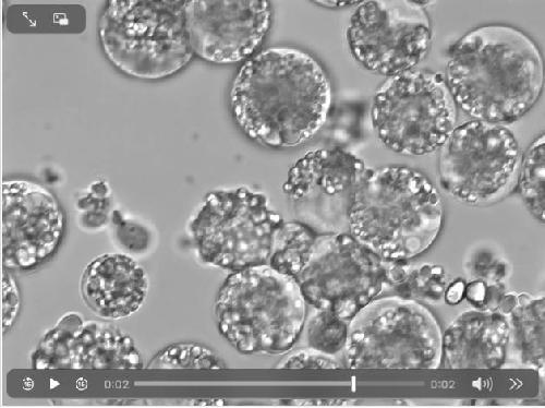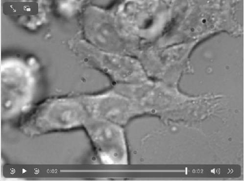 Still from Figure 5 - video 2 Knockdown of SerpinE2 prevents adhesion and migration of neural crest (NC) cells. Embryos were injected into the animal pole at the four-cell stage with 40 ng SerpinE2 morpholino oligonucleotides. The cranial NC was explanted at stage 16/17, plated on fibronectin and imaged 7 hr after culture. Filming was done for 10 min. Note that cells acquire a ball-like shape and freely float around. Scale bar, 10 m. |
