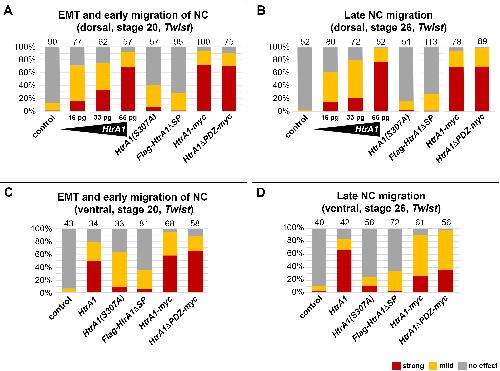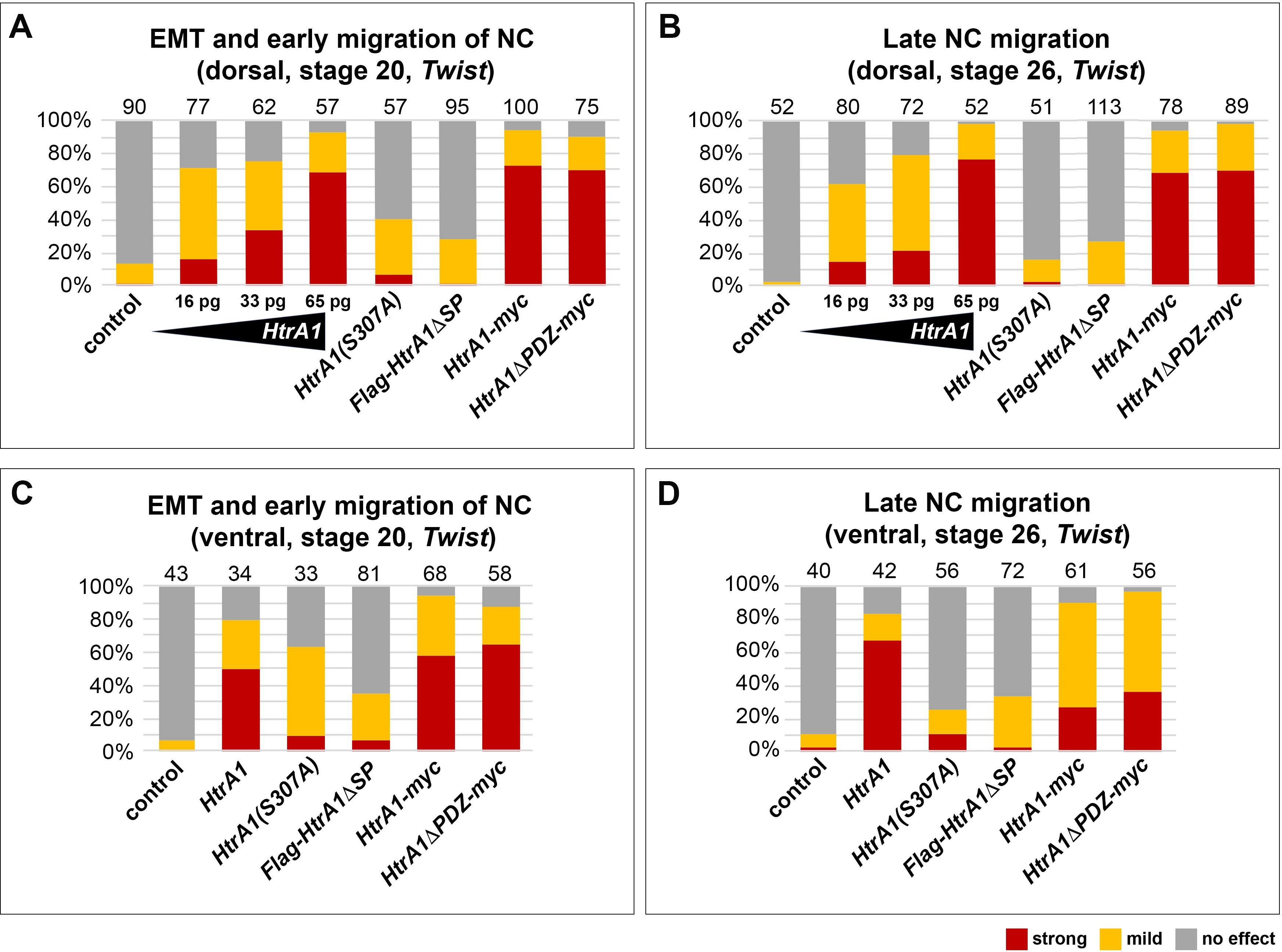 Figure 6—figure supplement 1 HtrA1 mRNA inhibits neural crest (NC) migration in a concentration-dependent manner. If not otherwise indicated, embryos were injected with 65 pg HtrA1-derived mRNAs into a single dorsal animal blastomere at the eight-cell stage. Quantification of epithelial-mesenchymal transition (EMT) and migration of Twist+ NC cells in embryos at stages 20 and 26. Defects were assessed based on a comparison of injected embryos and non-injected control siblings. Normal phenotypes are distinguished from phenotypes with either mild or strong defects in NC cell migration. A mild defect is defined as a reduction by more than 25% in at least one NC segment. A strong defect is a reduction by more than 50% in all NC segments. The number of analyzed embryos per sample is indicated above the columns. At least two experiments were done. (A, B) Following dorsal injection, HtrA1 mRNA blocks EMT and cell migration of NC cells in a dose-dependent manner. Note that HtrA1-myc and HtrA1ΔPDZ-myc mRNAs cause migration defects with a similar strength, whereas HtrA1(S307A) and Flag-HtrA1ΔSP mRNAs have only little effects. (C, D) Ventral injection of HtrA1 mRNA cause relatively mild NC migration defects. |