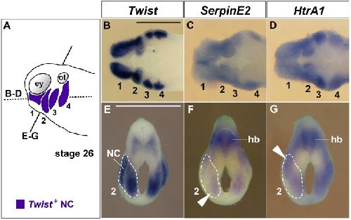 Figure 1figure supplement 1 Twist, SerpinE2, and HtrA1 gene expression in sections of tailbud stage embryos after whole-mount in situ hybridization. (A) Schematic of embryo at stage 26. Labeled in violet are the Twist-positive NC cells in the mandibular arch (1), hyoid arch (2), anterior branchial arch (3), and posterior branchial arch (4). Indicated are the level of horizontal sections in panels BD (strippled line) and the level of transversal sections in panels EG (continuous line). (BD) Horizontal hemisections viewed from dorsal. (EG) Transversal sections. The strippled line labels the Twist+ NC. Note the arrowheads indicating the ventral SerpinE2 and the dorsal HtrA1 expression domains in the NC of the hyoid arch. ey, eye; hb, hindbrain; NC, neural crest; ot, otic placode. Scale bars, 0.5mm. |