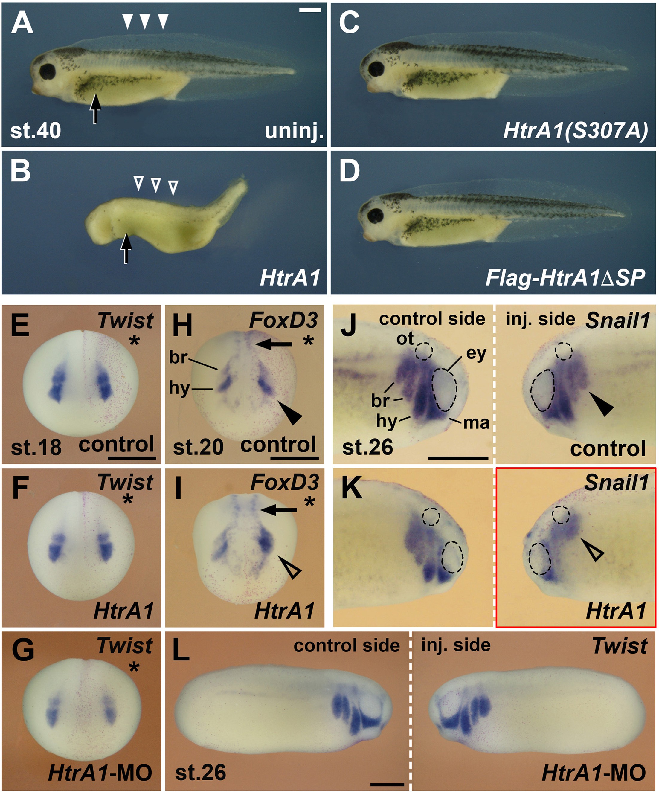 Figure 3. HtrA1 protease inhibits the formation of neural crest (NC)-derived structures and reduces NC migration. Embryos were injected into all animal blastomeres (AD) or a single dorsal animal blastomere (EL) at the eight-cell stage. (AD) Tadpoles at stage 40. HtrA1 mRNA causes reduction of head tissue, dorsal fin structures (arrowheads), and melanocytes (arrow), whereas HtrA1(S307A) and Flag-HtrA1SP mRNA have no effect. (EG) Anterior view of embryos at stage 18. Stars demarcate the injected sides. Neither 65 pg HtrA1 mRNA nor 10 ng HtrA1-MO do affect the specification of Twist+ cranial NC cells. (H, I) Anterior view of embryos at stage 20. 65 pg HtrA1 mRNA reduces the epithelial-mesenchymal transition (EMT) of Foxd3+ cranial NC cells (arrowheads) but does not affect the specification of trunk NC cells (arrows). (JL) Lateral view of embryos at stage 26. The migration of NC cells (arrowheads) is reduced by 65 pg HtrA1 mRNA but not affected by 10 ng HtrA1-MO. br, branchial crest segments; ey, eye; hy, hyoid crest segment; ma, mandibular crest segment; ot, otic vesicle. Unless otherwise noted, the mRNA doses of HtrA1 and derived constructs per embryo were 100 pg. Indicated phenotypes were shown in B, 98/100; C, 74/83; D, 84/87; E, 31/31; F, 51/53; G, 59/60; H, 28/31; I, 23/26; J, 9/10; K, 21/21; L, 58/79 embryos; at least two independent experiments. Scale bars, 0.5 mm. |