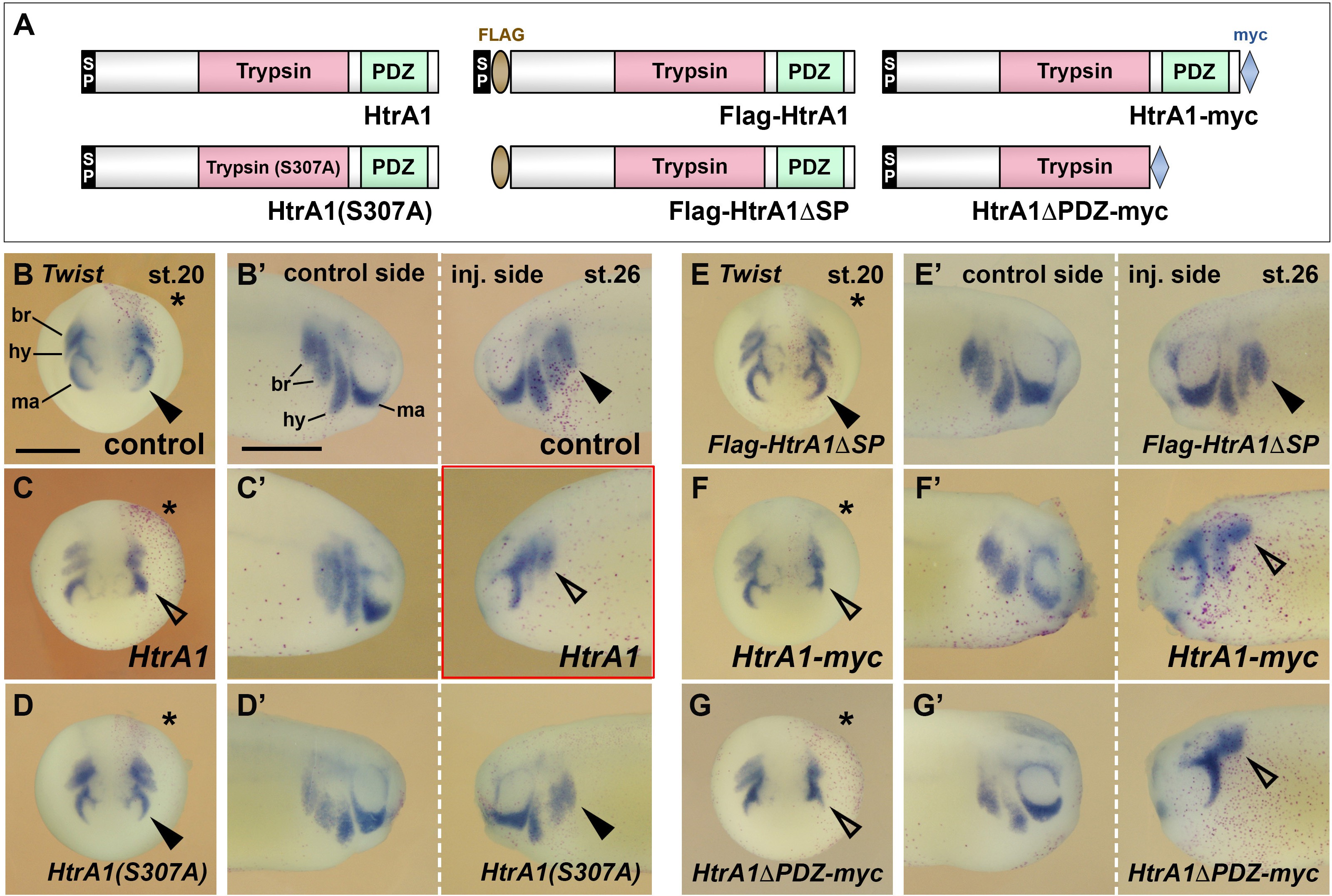 Figure 6. HtrA1 inhibits neural crest (NC) migration as an extracellular protease. Embryos were injected into a single dorsal animal blastomere at the eight-cell stage. A star labels the injected side.Twist expression demarcates the NC in embryos at stage 20 (BG; anterior view) and stage 26 (BG; lateral view). (A) Overview of wild-type (top) and mutant (bottom) HtrA1 protein constructs. (BE) HtrA1 mRNA, but neither HtrA1(S307A) nor Flag-HtrA1SP mRNAs, reduces epithelial-mesenchymal transition (EMT) and migration of NC cells on the injected side (arrowheads). Note that the diffusible HtrA1 protein reduces NC cell migration to a lower extent also on the non-injected side. (FG) Both HtrA1-myc and HtrA1PDC-myc mRNAs reduce NC EMT and migration. br, branchial segments; hy, hyoid segment; ma, mandibular segment. Injected mRNA doses per embryos are 65 pg. Scale bars, 0.5mm. For quantification of NC migration defects, see Figure 6figure supplement 1A and B. |