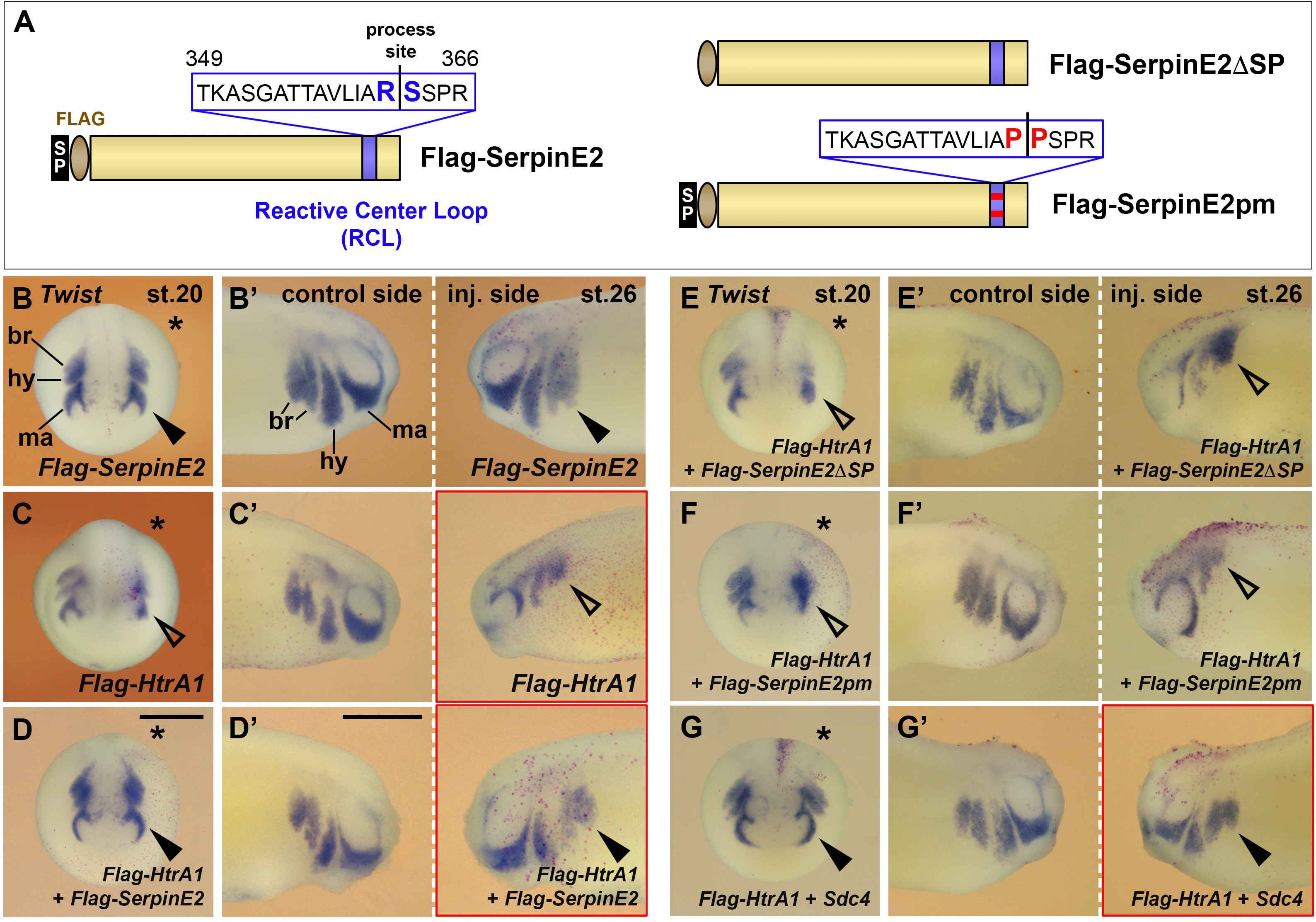 Figure 7. SerpinE2 and HtrA1 interact with Syndecan-4 (Sdc4) in neural crest (NC) cell migration. mRNAs were injected into one dorsal animal blastomere at the eight-cell stage. Embryos are shown in anterior view (stage 20, injected side labeled with a star, BG) and lateral view (stage 26, BG). (A) Overview of wild-type (left) and mutant (right) SerpinE2 protein constructs. (B, B) 4 ng Flag-SerpinE2 mRNA has no effect on the migration of Twist+ NC cells (filled arrowheads). (C, C) Flag-HtrA1 inhibits NC cell migration robustly on the injected sides (open arrowheads). (DF) SerpinE2 mRNA, but neither Flag-SerpinE2SP nor SerpinE2pm mRNA, rescues normal epithelial-mesenchymal transition (EMT) and migration of NC cells upon co-injection with Flag-HtrA1. (G, G) Sdc4 mRNA restores normal NC migration in Flag-HtrA1-injected embryos. If not otherwise indicated, injected mRNA doses per embryos are 65 pg (Flag-HtrA1), 333 pg (Flag-SerpinE2 derived constructs), and 450 pg (Sdc4). Scale bars, 0.5mm. For quantification of NC migration defects, see Figure 7figure supplement 1A and B. |