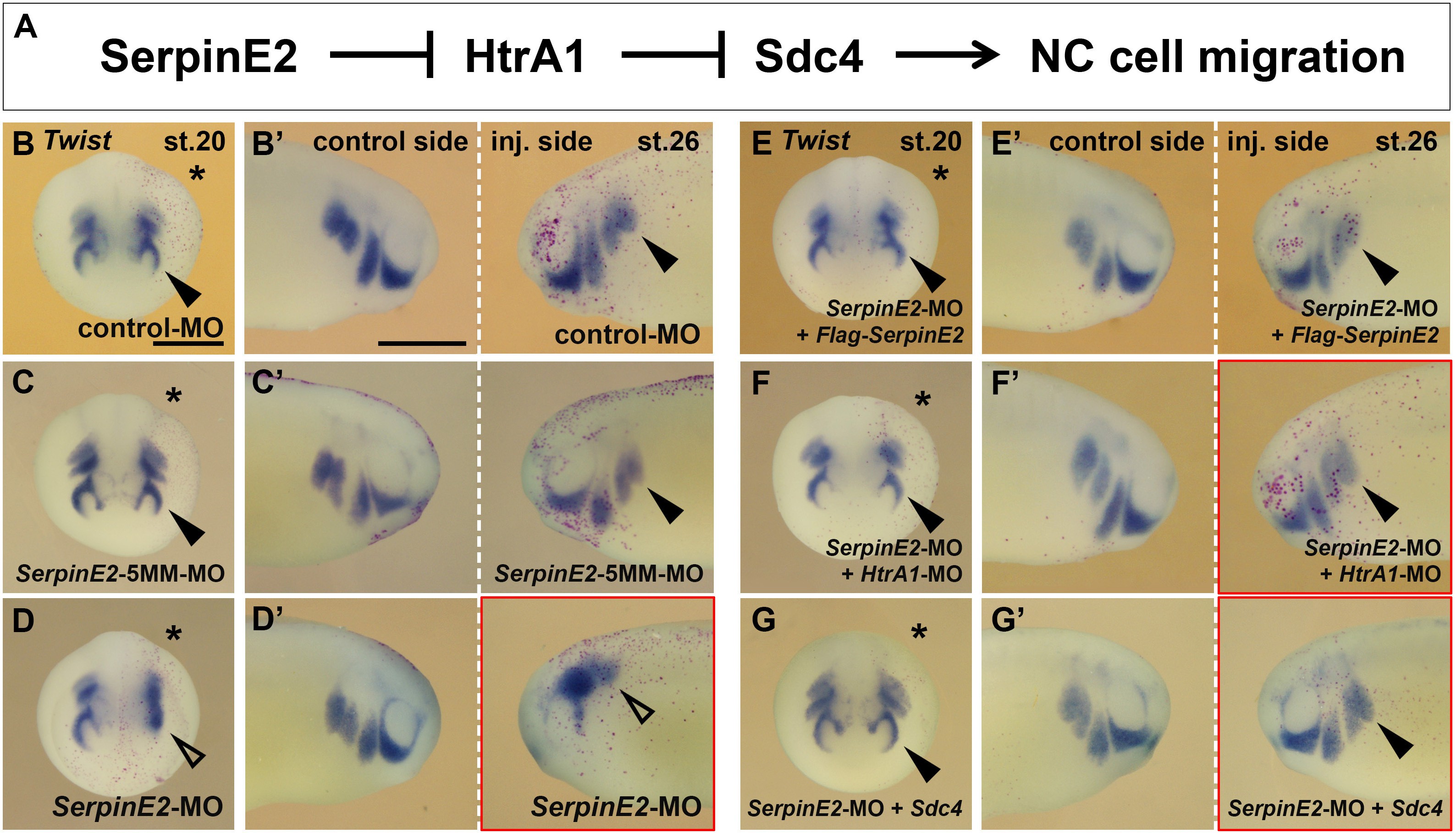 Figure 8. SerpinE2 functions in neural crest (NC) cell migration in an HtrA1- and Syndecan-4 (Sdc4)-dependent manner. mRNAs and morpholino oligonucleotides (MOs, 10 ng) were injected into one dorsal animal blastomere at the eight-cell stage. Embryos are shown in anterior view (stage 20, injected side labeled with a star, BG) and lateral view (stage 26, BG). (A) Proposed mechanism for the regulation of NC migration by SerpinE2, HtrA1, and Sdc4. (BD) SerpinE2-MO blocks epithelial-mesenchymal transition (EMT) and migration of Twist+ NC cells (arrow) on the injected side, while control-MO and SerpinE2-5MM-MO have no effect. (EG) Flag-SerpinE2 mRNA, HtrA1-MO, and Sdc4 mRNA restore normal NC migration in SerpinE2-morphant embryos. Injected mRNA doses per embryos are 333 pg (Flag-SerpinE2) and 450 pg (Sdc4). Scale bars, 0.5mm. For quantification of NC migration defects, see Figure 8figure supplement 1A and B. |
