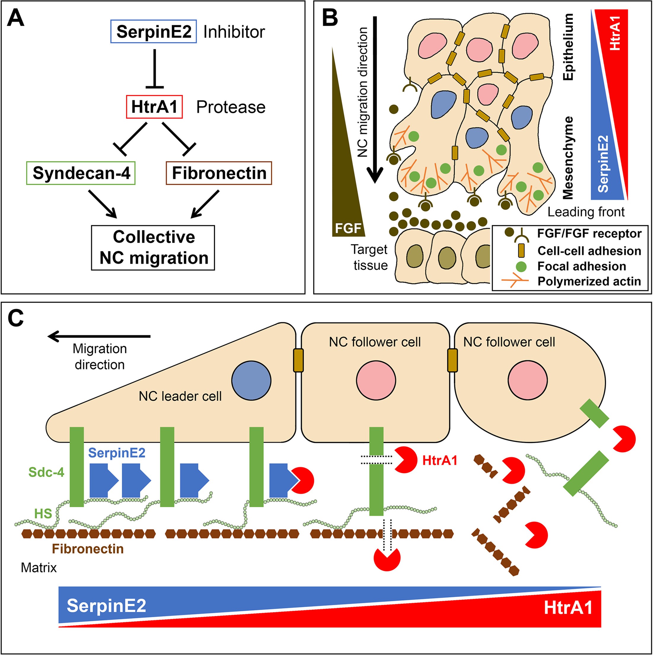 Figure 9. Model for a proteolytic pathway of SerpinE2 and HtrA1 that regulates collective neural crest migration. (A) SerpinE2 stimulates collective NC migration by a double-inhibitory mechanism involving the secreted serine protease HtrA1 and its proteolytic substrates Syndecan-4 and fibronectin. (B) Opposing gradients of SerpinE2 and HtrA1 activities regulate the directed migration in a collective of NC cells. The SerpinE2/HtrA1 pair contributes to the formation of a chemoattractant gradient that guides the NC stream toward a source of FGF signals in the target tissue. High SerpinE2 and low HtrA1 levels coincide with abundant focal adhesion sites and polymerized actin that drive mesenchymal migration at the leading edge. (C) SerpinE2 anchored to the heparan sulfate chains of the transmembrane proteoglycan Syndecan-4 protects the integrity of focal adhesions at the leading front and allows collective cell migration to occur (left side). Unbound HtrA1 triggers the proteolytic cleavage of Syndecan-4 and degrades the matrix protein fibronectin (middle), causing loss of cell-matrix adhesion at the rear end of the NC cell collective (right side). FGF, fibroblast growth factor; HS, heparan sulfate; NC, neural crest; Sdc4, Syndecan-4. |