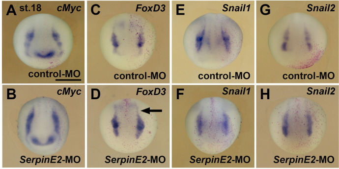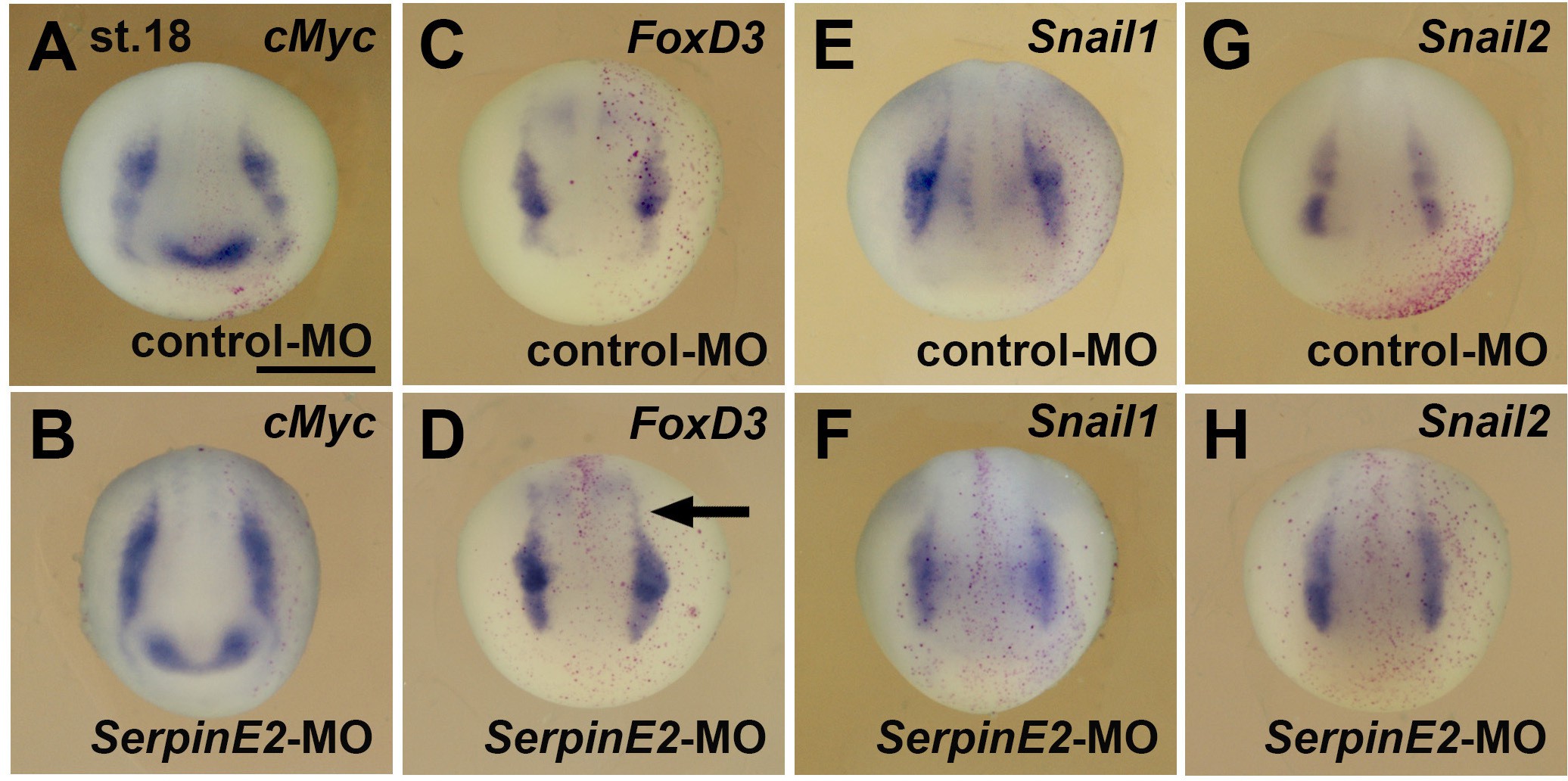 Figure 2 figure supplement 1 SerpinE2 depletion does not affect the specification of neural crest cells. (AH) Anterior view of embryos at stage 18 after whole-mount in situ hybridization. Note that neither control-MO (A, C, E, G) nor SerpinE2-MO (B, D, F, H) affect the expression of the neural crest cell markers cMyc, FoxD3, Snail1, and Snail2. The arrow demarcates the trunk neural crest. Embryos were injected into a single animal blastomere at the eight-cell stage with 10 ng morpholino oligonucleotide (MO) and 100 pg nlacZ mRNA as lineage tracer (red nuclei). Indicated phenotypes were shown in A, 5/5; B, 9/9; C, 8/8; D, 9/9; E, 6/6; F, 6/7; G, 8/8; H, 5/6. Scale bar, 0.5mm. |