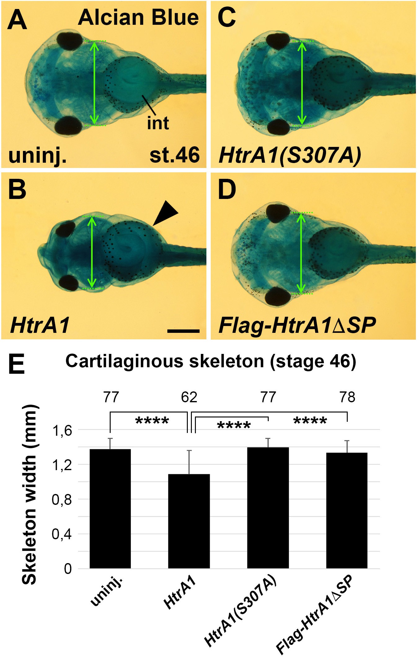 Figure 4 - figure supplement 1 Overexpression of HtrA1 decreases cartilaginous elements and craniofacial structures. Embryos were injected into four animal blastomeres at the eight-cell stage with a total of 100 pg mRNA. (AD) Ventral view of embryos at stage 46 after Alcian Blue staining. Note that HtrA1 mRNA decreases the skeleton width (double arrow at the level of the ceratobranchial cartilage structures) but does not affect gut coiling (arrowhead). HtrA1(S307A) and HtrA1SP mRNAs have no effects. (E) Quantification of the skeleton width. The number of analyzed specimen is indicated above each column. int, intestine. Indicated phenotypes were shown in A, 73/74; B, 58/62; C, 73/77; D, 67/78 embryos. Scale bar, 0.5mm. Data in all graphs are displayed as mean SD, n 2; ****p<0.0001, one-way ANOVA followed by Tukeys post hoc test. |