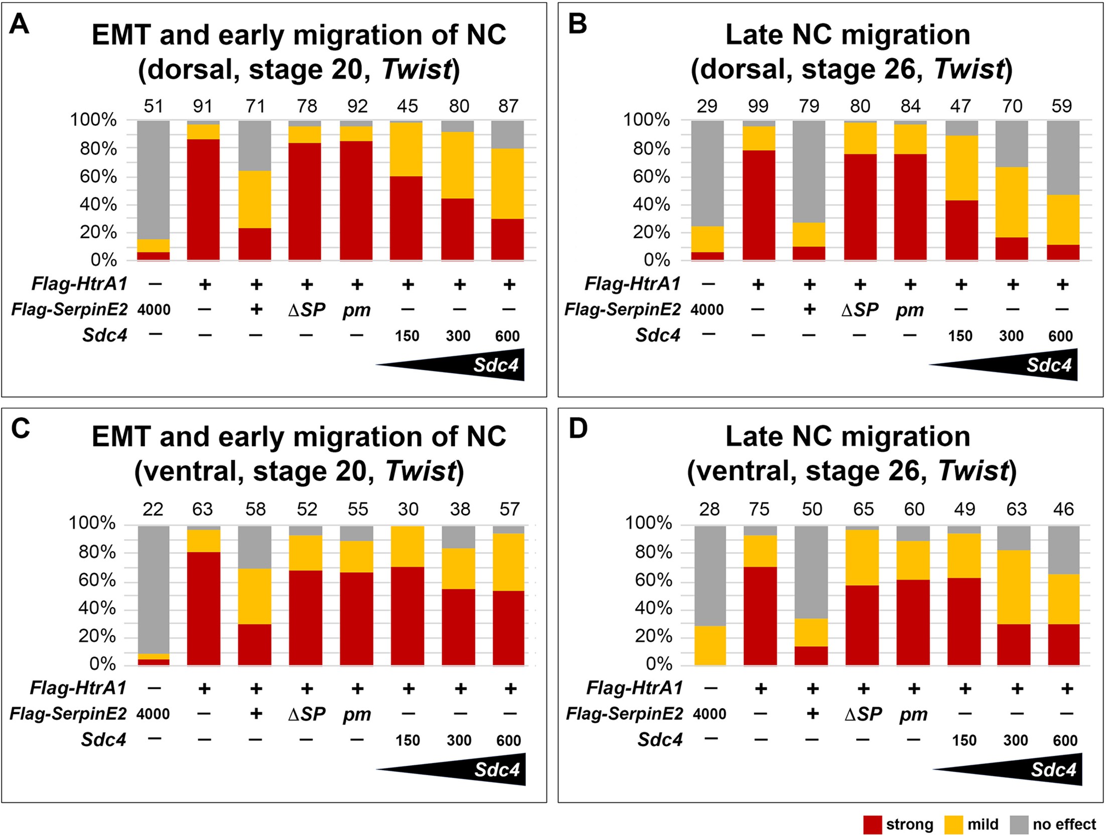 Figure 7—figure supplement 1 SerpinE2 and Sdc4 mRNAs partially rescue neural crest (NC) migration defects that are induced by HtrA1 overexpression. Quantification of epithelial-mesenchymal transition (EMT) and migration of Twist+ NC cells in embryos at stages 20 and 26. Defects were assessed based on a comparison of injected embryos and non-injected control siblings. The number of analyzed embryos per sample is indicated above the columns. Note that secreted Flag-SerpinE2, but not the cytosolic Flag-SerpinE2ΔSP and mutant Flag-SerpinE2pm constructs, revert NC migration defects in Flag-HtrA1 mRNA-injected embryos. (A, B) Dorsal injection of Sdc4 mRNA rescues Flag-HtrA1-induced migration defects in a dose-dependent manner. (C, D) Sdc4 mRNA is less efficient in rescuing NC migration upon ventral co-injection with Flag-HtrA1 mRNA. Embryos were injected into one animal blastomere at the eight-cell stage with mRNA doses of 65 pg (Flag-HtrA1) and 200 pg (SerpinE2-derived). Indicated Sdc4 mRNA amounts per embryo are in pg. Experiments were done at least three times. Sdc4, Syndecan-4. |