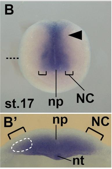 serpine2 (serpin peptidase inhibitor, clade E (nexin, plasminogen activator inhibitor type 1), member 2) gene expression in X. laevis embryo, NF stage 17, assayed via in situ hybridization, anterior-dorsal view (B) and in transverse section through trunk region (B'), dorsal up. |