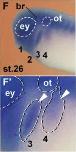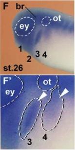 htra1 (htra serine peptidase 1) gene expression in X. laevis embryo, NF stage 26, assayed via in situ hybridization, lateral view, anterior left, dorsal up (F), and magnified view of branchial crest region (F'). |
