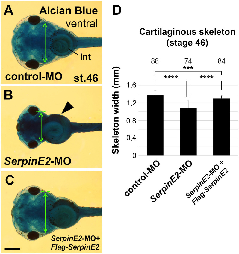 Figure 4 - figure supplement 2 Knockdown of SerpinE2 reduces craniofacial skeleton formation. Morpholino oligonucleotides (MOs) were injected into Xenopus embryos at the eight-cell stage. (AC) Ventral view of tadpoles at stage 46 after Alcian Blue staining. Note that SerpinE2-MO decreases the branchial skeleton width (double arrow) but does not affect gut coiling (arrowhead). The control-MO and a combination of SerpinE2-MO and Flag-SerpinE2 mRNA have no effects. (D) Quantification of the skeleton width. The number of analyzed specimen is indicated above each column. Embryos were injected into four animal blastomeres with a total of 40 ng MO. int, intestine. Indicated phenotypes were shown in A, 76/88; B, 72/74; C, 78/85. Scale bar, 0.5mm. Data in all graphs are displayed as mean SD, n 3; ***p<0.001, ****p<0.0001, one-way ANOVA followed by Tukeys post hoc test. |