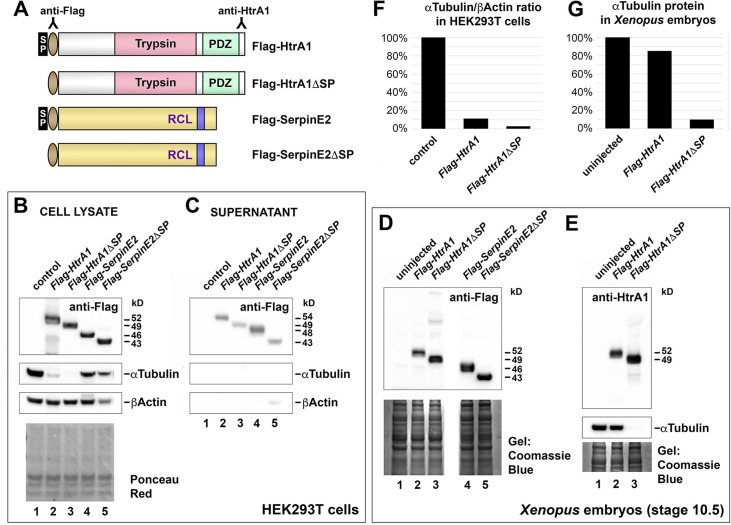 Figure 6—figure supplement 2 Cytoplasmic HtrA1 causes reduction of αTubulin protein levels in mammalian cells and Xenopus embryos. (A) Schematic representation of the protein constructs. Indicated are antibody binding sites. RCL, reactive center loop; SP, signal peptide. (B, C) Western blot analysis of cell lysate and culture supernatants. HEK293T cells were transiently transfected with pCS2 vector constructs containing Flag epitope-tagged cDNAs encoding HtrA1, HtrA1ΔSP, SerpinE2, and SerpinE2ΔSP. Note that Flag-HtrA1 and Flag-SerpinE2 have higher molecular weights in the supernatant (54 and 48 kD) than in the cell lysate (52 and 46 kD), indicating that these proteins are glycosylated in the secretory pathway. Flag-HtrA1ΔSP and Flag-SerpinE2ΔSP are less abundant in the supernatant, and their molecular weights (49 and 43 kD) the same as in the cell lysate, suggesting that these signal peptide-deficient proteins are not secreted and their low levels in the supernatant likely due to cell lysis. Empty vector was used as negative control. Ponceau Red staining of membrane shows equal amounts of protein in the lysate samples. (D, E) Western blot analysis of Xenopus embryos at stage 10.5. Embryos were injected into the animal pole at the four- to eight-cell stage. Injected mRNA doses per embryo were 320 pg (HtrA1-derived) and 4 ng (SerpinE2-derived). Coomassie blue staining shows equal protein loading in the gels. (F, G) Quantification of αTubulin protein levels relative to βActin in HEK293T cells (F) and relative to Ponceau Red staining in Xenopus embryos at stage 10.5 (G). Experiments were done at least twice. |