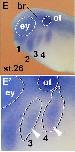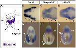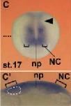 htra1 (htra serine peptidase 1) gene expression in X. laevis embryo, NF stage 17, assayed via in situ hybridization, anterior-dorsal view (C) and in transverse section through trunk region (C'), dorsal up. |