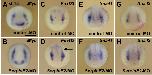 Figure 1. SerpinE2 and HtrA1 are expressed in the neural crest. Xenopus embryos were analyzed by whole-mount in situ hybridization. (AC) Anterior view of embryos at stage 17. The brackets point to pre-migratory NC cells on each side of the neural plate. The numbers label the Twist-expressing cranial NC segments: 1, mandibular; 2, hyoid; 3, anterior branchial; 4, posterior branchial. Arrowheads show SerpinE2 and HtrA1 transcripts in the trunk NC. The stippled lines indicate the level of sections in AC. (AC) Transversally hemisectioned embryos. SerpinE2 and HtrA1 signals appear in the NC (strippled circle lines). Note that SerpinE2 is also expressed in the inner sensorial layer of the neural plate and underlying notochord, whereas HtrA1 expression is more abundant in the outer ependymal layer of the neural plate. (DF) Lateral view of embryos at stage 26. SerpinE2 and HtrA1 are expressed in Twist+ NC cell streams (14). Transcripts of both genes can also be seen in the brain, eye, and otic placode. (DF) Magnification of embryos. Arrowheads demarcate SerpinE2 transcripts near the front (E) and HtrA1 transcripts at the rear end (F) of the migrating NC cell collectives in the branchial arches. (G, H) Summary of gene expression domains. At stage 17, SerpinE2 is transcribed in ventral and HtrA1 in dorsal cells of the pre-migratory NC (G). At stage 26, SerpinE2 is expressed in leader cells and HtrA1 in follower cells of migrating NC streams (H).br, brain; ey, eye; NC, neural crest; np, neural plate; nt, notochord; ot, otic placode. Scale bars, 0.5 mm. |