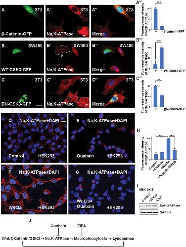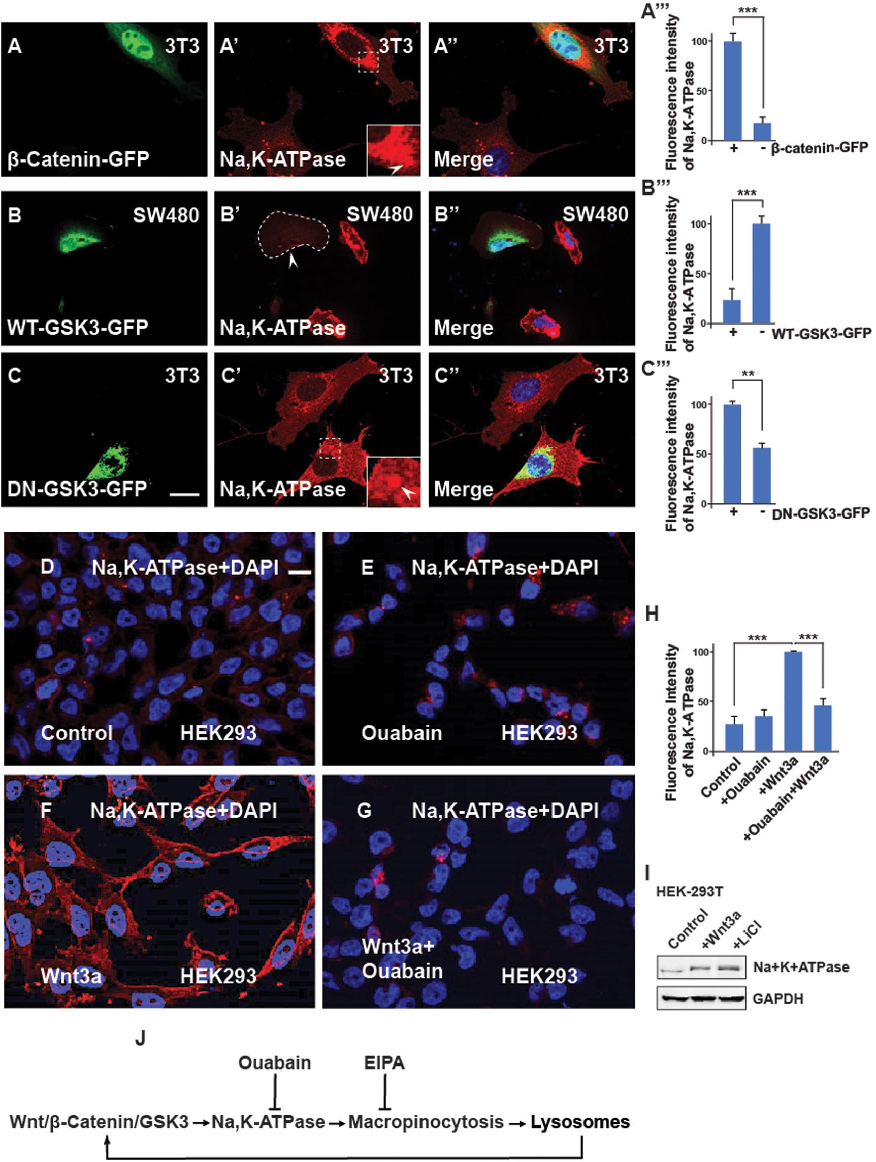 Fig. 2.The Na,K-ATPase is required for Wnt signaling and its regulation is via GSK3. (A-A‴) 3T3 cells transfected with the stabilized constitutively active forms of β-catenin-GFP show increased levels of Na,K-ATPase compared to untransfected neighbor cells used as a control. Quantification is shown on the right side. (B-B‴) Overexpression of WT-GSK3-GFP (demarcated by a stippled line) in CRC SW480 cells blocks the Na,K-ATPase stabilization by Wnt. (C-C‴) Transfecting DN-GSK3-GFP (DN-GSK3-GFP) in 3T3 cells increases Na,K-ATPase levels. Note that the accumulation is observed in vesicles (indicated by the stippled box). (D) HEK293BR (BAR/Renilla) cells stained with Na,K-ATPase antibody. (E) HEK293BR cells treated with the Na,K-ATPase inhibitor Ouabain (1 µM) overnight showed no changes in Na,K-ATPase levels. (F) Overnight treatment with Wnt3a protein (100 ng/ml from Peprotech) treatment stabilized Na,K-ATPase. (G) Ouabain blocked Na,K-ATPase stabilization due to Wnt3a. (H) Quantification of the fluorescence intensity of the Na,K-ATPase from D-G. (I) Western blot showing that endogenous levels of Na,K-ATPase increase after activating the canonical Wnt pathway. (J) Diagram showing that Na,K-ATPase is positively regulated by Wnt via macropinocytosis in lysosomes. EIPA blocks macropinocytosis; Ouabain blocks the Na,K-ATPase, and lysosomes enhance Wnt. All experiments with cultured cells were biological triplicates. Scale bars: 10 μm. Error bars denote s.e.m. (n≥3) (**P<0.01, ***P<0.001). |
