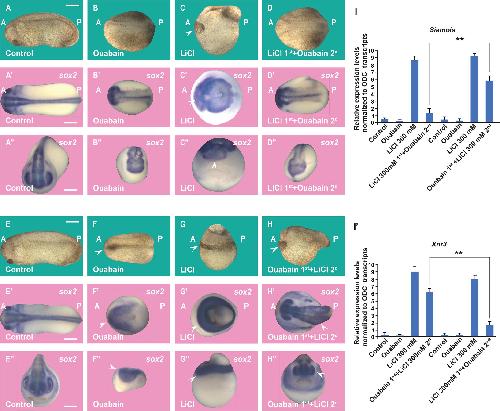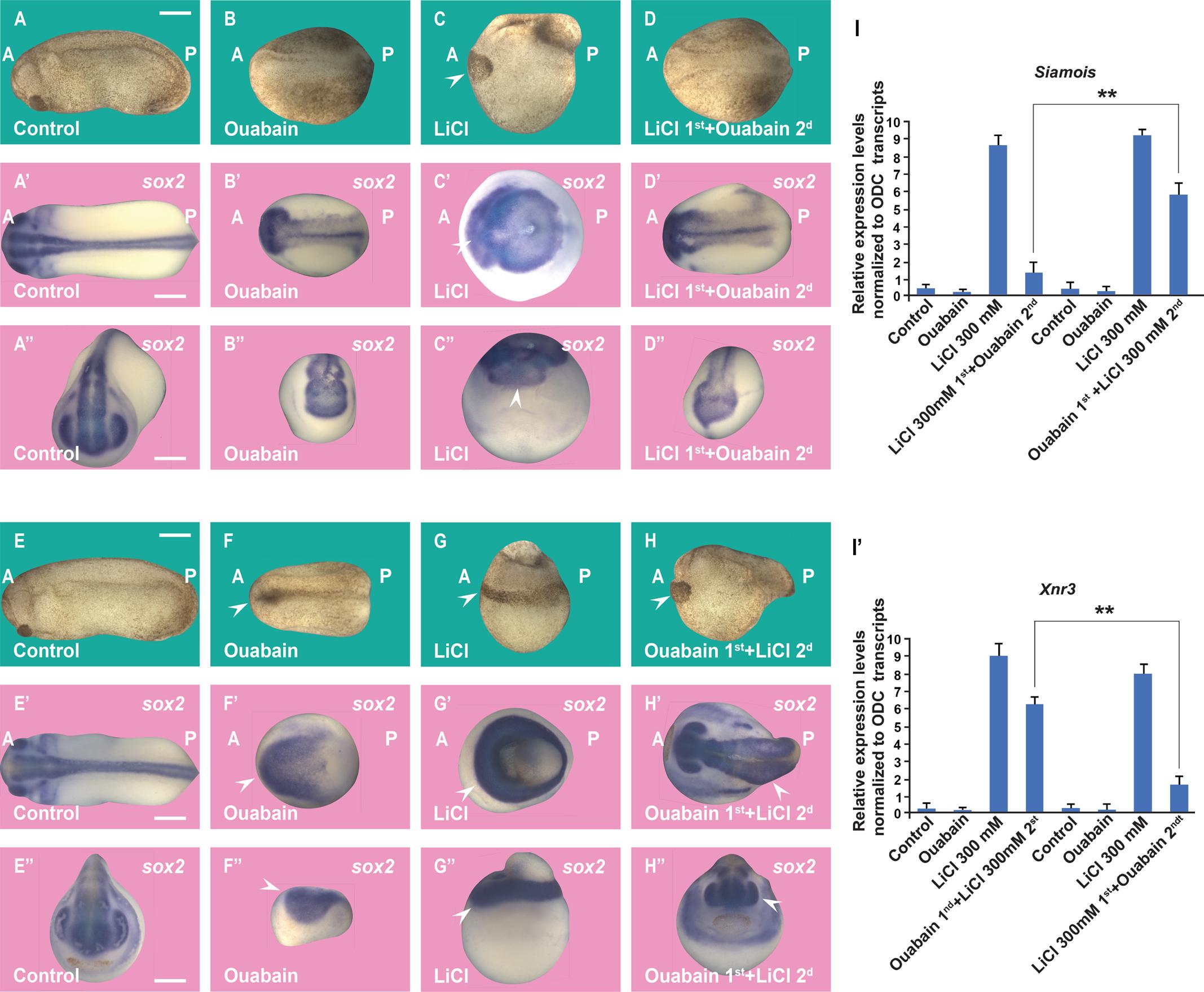 Fig. 5.Order-of-addition experiment showing that Wnt/β-catenin activation at the 32-cell stage is inhibited by Ouabain and can be rescued by subsequent GSK3 inhibition in Xenopus embryos. (A) Untreated embryo. (B) Ouabain incubation (10 μM in 20% L-15 medium for 7 min at the 32-cell stage) resulted in ventralized embryos. (C) LiCl (300 mM for 7 min) dorsalized embryos resulting in expanded heads and reduced trunks. (D) The dorsalized phenotype due to LiCl treatment was blocked after subsequent incubation with Ouabain. (A′-D′) In situ hybridization of Sox2 expression at the gastrula stage showing reduction of CNS development by Ouabain and its expansion by LiCL in dorsal views. The radial expanded CNS phenotype by treating first with LiCl incubation was inhibited by secondary Ouabain incubation. (A″-D″) Anterior views of the same embryos shown in A′-D′. (E-H) Embryos at the 32-cell stage were treated with Ouabain for 7 min (10 µM in 20% L-15 culture medium without serum), washed twice in 0.1 MMR saline, then immersed in 300 mM LiCl in MMR for an additional 7 min, all within the 32-cell stage. Note that treatment with LiCL secondly restored head structures. (E′-H′) In situ hybridizations of the neural marker Sox2 at the gastrula stage show that the ventralized phenotype due to Ouabain was rescued by subsequent LiCl treatment. (E″-H″) Anterior views from the same embryos are shown in panels E′ to H′. (I-I′) Quantitative RT-PCR (qPCR) for the Wnt target genes Siamois and Xnr3 at blastula stage 9 (about 7 h of development), shows that the phenotypic effects are due to the early activation of the Wnt pathway. The numbers of embryos analyzed are as follows: A: 82, 100%; B: 95, 96%; C: 110, 99%; D: 87, 94%; five independent experiments; A′: 33, 100%; B′: 29, 92%; C: 34, 100%; D: 31, 92%; E: 78, 100%; F: 83, 95%; G: 92, 99%; H: 85, 94%; E′: 28, 100%; F′: 33, 96%; G′: 30, 100%; H′: 35, 95%. Scale bars: 500 μm. Error bars denote SEM (n≥3) (**P<0.01). |