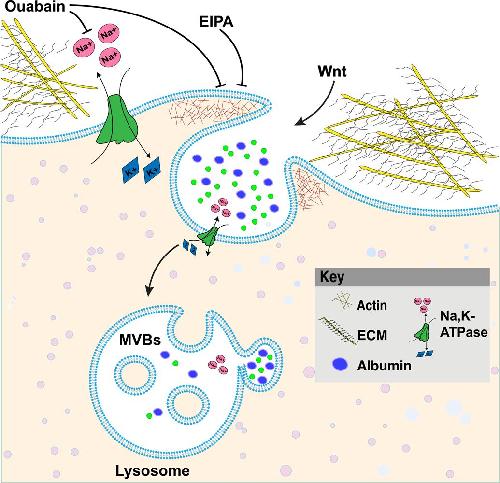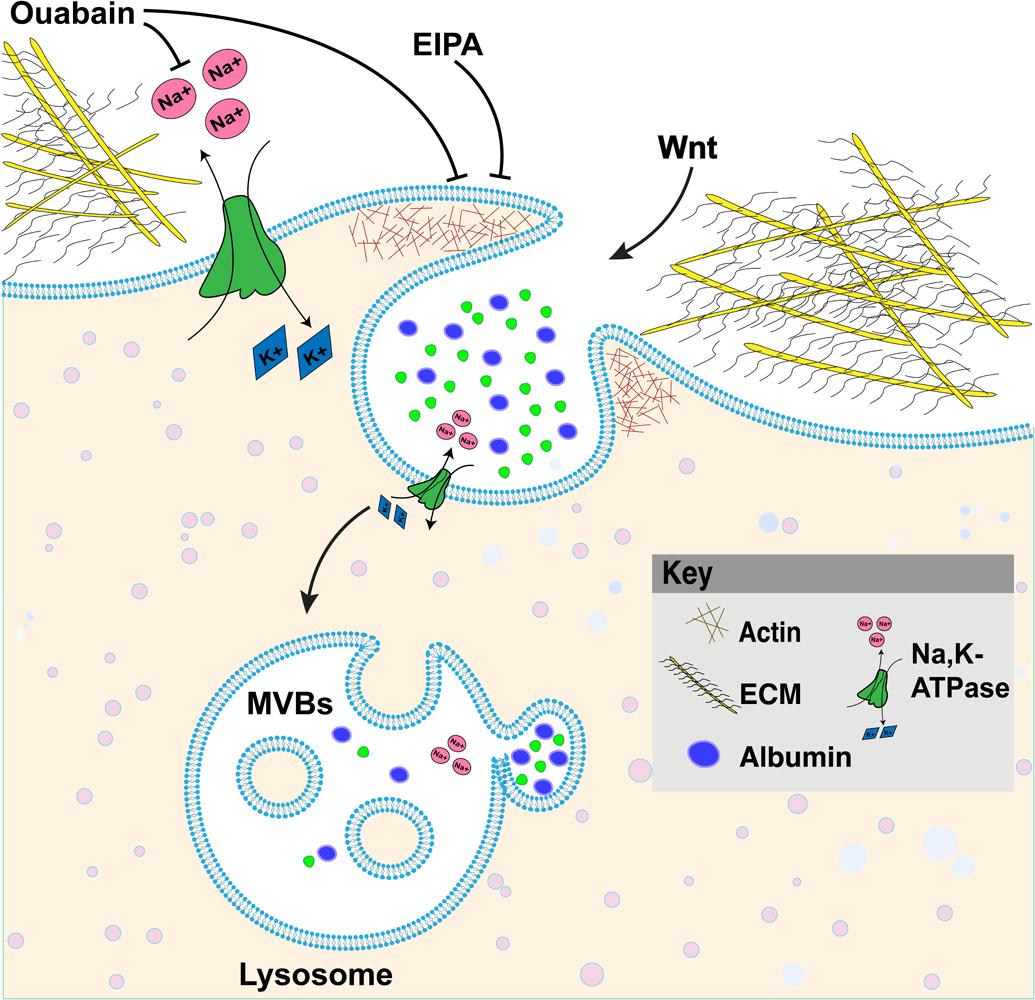 Fig. 6.Model of Ouabain blocking the Na,K-ATPase pump and macropinocytosis, resulting in inhibition of Wnt signaling. The Na,K-ATPase transmembrane protein is a member of the P-type ATPase family that pumps three Na+ ions out of cells while pumping two K+ ions into cells, establishing the electrical potential across membranes. The cardiotonic steroid Ouabain is a selective Na,K-ATPase inhibitor targeting the α1-subunit that blocks macropinocytosis, lysosomes, and Wnt signaling. |