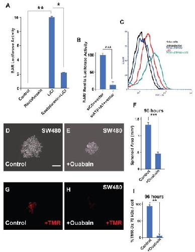 Fig. S2. Ouabain Blocks Macropinocytosis in CRC SW480 Spheroids; Related to Figure 3 (A) Rostafuroxin/PST2238, which binds specifically to the extracellular domain of ATP1A1, used as a second Na,K-ATPase inhibitor, decreased β-catenin signaling stimulated by LiCl. (B) The depletion of ATP1A1 (A1-subunit of the NA,K-ATPase pump) using a siRNA in SW480 cells. This results in decreased β-catenin transcriptional activity as measured by the BAR-luciferase assay. (C) Flow cytometry analysis shows that overexpression of ATP1A1 increases β-catenin levels in HeLa cells. Black: untransfected control HeLa cells; blue: HeLa cells overexpressing ATP1A1; red: untransfected HeLa cells treated with LiCl; green: HeLa cells overexpressing ATP1A1 and treated with LiCl. Each experiment was conducted three or more times. The overexpression of ATP1A1 (blue) shows no significant changes in -catenin levels compared to controls. The treatment by LiCl (red) increases the -catenin level 1.7-fold compared to controls (unpaired ttest, t = 8.437, df = 4, **p = 0.0011). The overexpression ATP1A1 combined with LiCl treatment (green) increases the -catenin level 2.2-fold compared to controls (Unpaired t-test, t = 8.563, df = 4, **p = 0.0010) and 1.3-fold compared to LiCl treatment only (Unpaired t-test, t = 3.429, df = 4, *p = 0.0266). Thus, we conclude that the overexpression of ATP1A1 enhances the activation of the Wnt pathway. (D) SW480 spheroids after 96 hours in inverted drop culture. (E) Ouabain (40 M) treatment affects the ability to form spheroids in 3D cultures. (F) Quantification of the spheroid area after Ouabain treatment. (G) Spheroids incubated with the macropinocytosis marker TMR-dextran 70kDa (1 mg/mL) for 1 hour. (H) Ouabain treatment reduces macropinocytosis of TMR-dextran 70 kDa. (I) Quantification of macropinocytic uptake inhibition caused Ouabain treatment. All experiments with cultured cells were biological triplicates. Eight spheroids were plated per condition, in triplicate. Error bars denote SEM (n ≥ 3) (*** p < 0.001, ** p < 0.01, and * p < 0.05). Scale bars, 500 μm. |