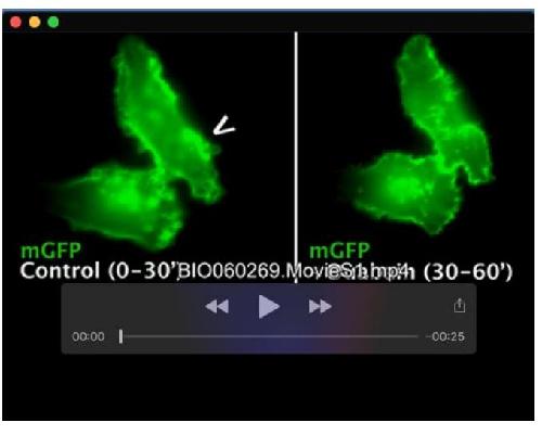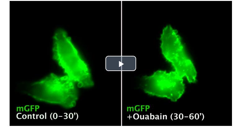 Movie 1.The Sustained Plasma Membrane Macropinosome Ruffles Characteristic of Cancer Cells with Activating Wnt Pathway Mutation Stop within Minutes of Addition of Ouabain; Related to Fig. 3. SW480 cells have sustained macropinocytosis [5] that involves the uptake of significant extracellular fluid and solutes by forming large vesicles (>0.2 μm) called macropinosomes (arrow) that were reduced rapidly after treatment with Ouabain (200 nM). Since macropinocytosis is required for Wnt signaling [50]–[54], blocking macropinocytosis explains the potent inhibitory effects of Ouabain on canonical Wnt signaling. |