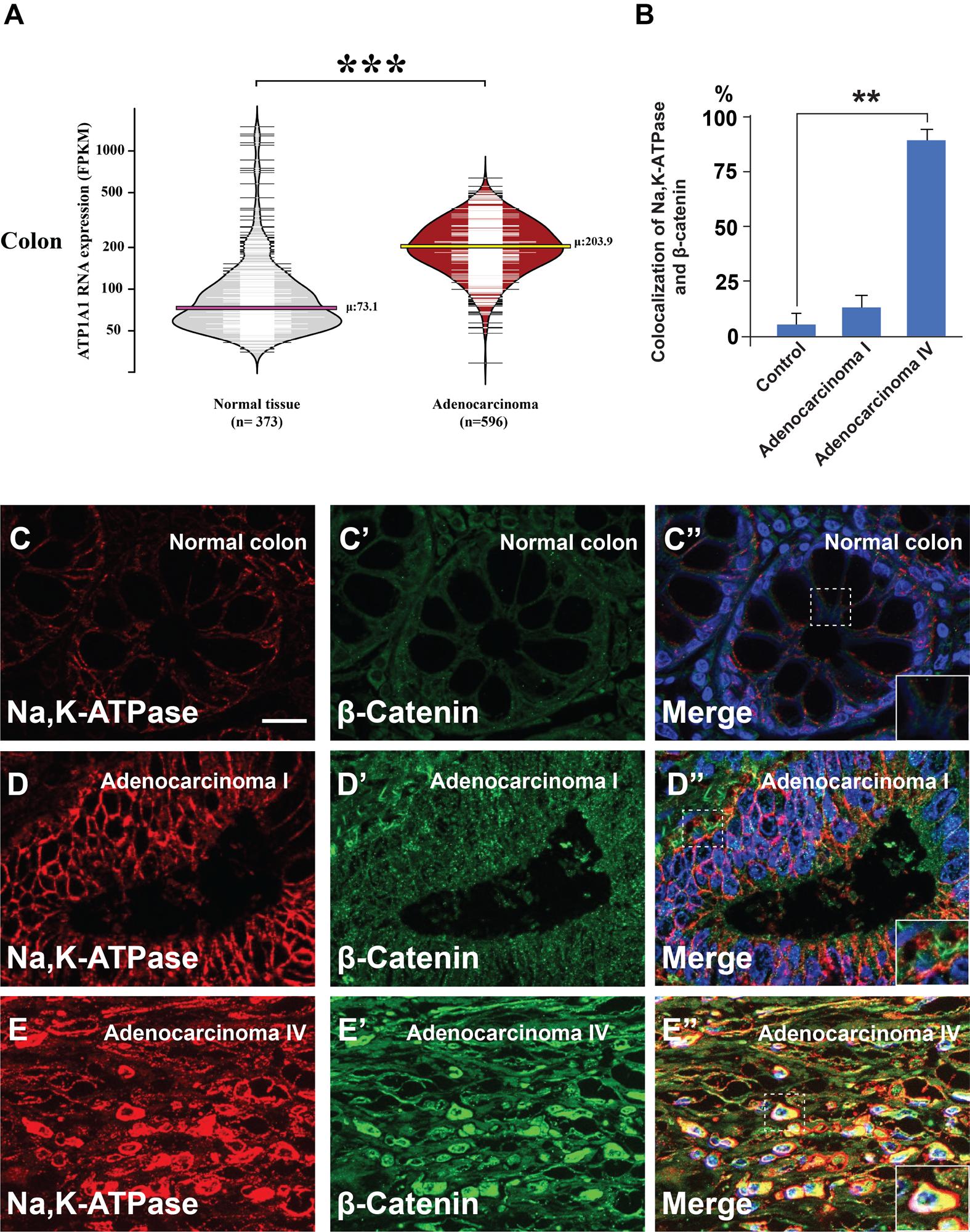 Fig. 1.Na,K-ATPase subunit α is overexpressed in colon cancer. (A) ATP1A1 RNA overexpression is significantly associated with colon adenocarcinoma. Bean plot analyses of ATP1A1 expression in 596 adenocarcinomas and 373 healthy colon samples reveal an approximately threefold difference in expression. The width of the horizontal lines represents the number of samples at each value, while the pink and yellow lines indicate the average ATP1A1 expression in normal colon and adenocarcinoma, respectively. The triple black asterisk indicates a P-value of 2.33×10−23 obtained via a two-tailed Student's t-test. (B) Quantification of the colocalization between Na,K-ATPase, and β-catenin in normal colon and in advanced stages of cancer from human array sections. (C-E″) Immunohistochemistry from B shows strong colocalization between Na,K-ATPase and β-catenin in advanced colon cancers (inset). Error bars denote SEM (n≥3) (**P<0.01). Scale bars: 10 μm. Human array sections were quantified in triplicate fields. |