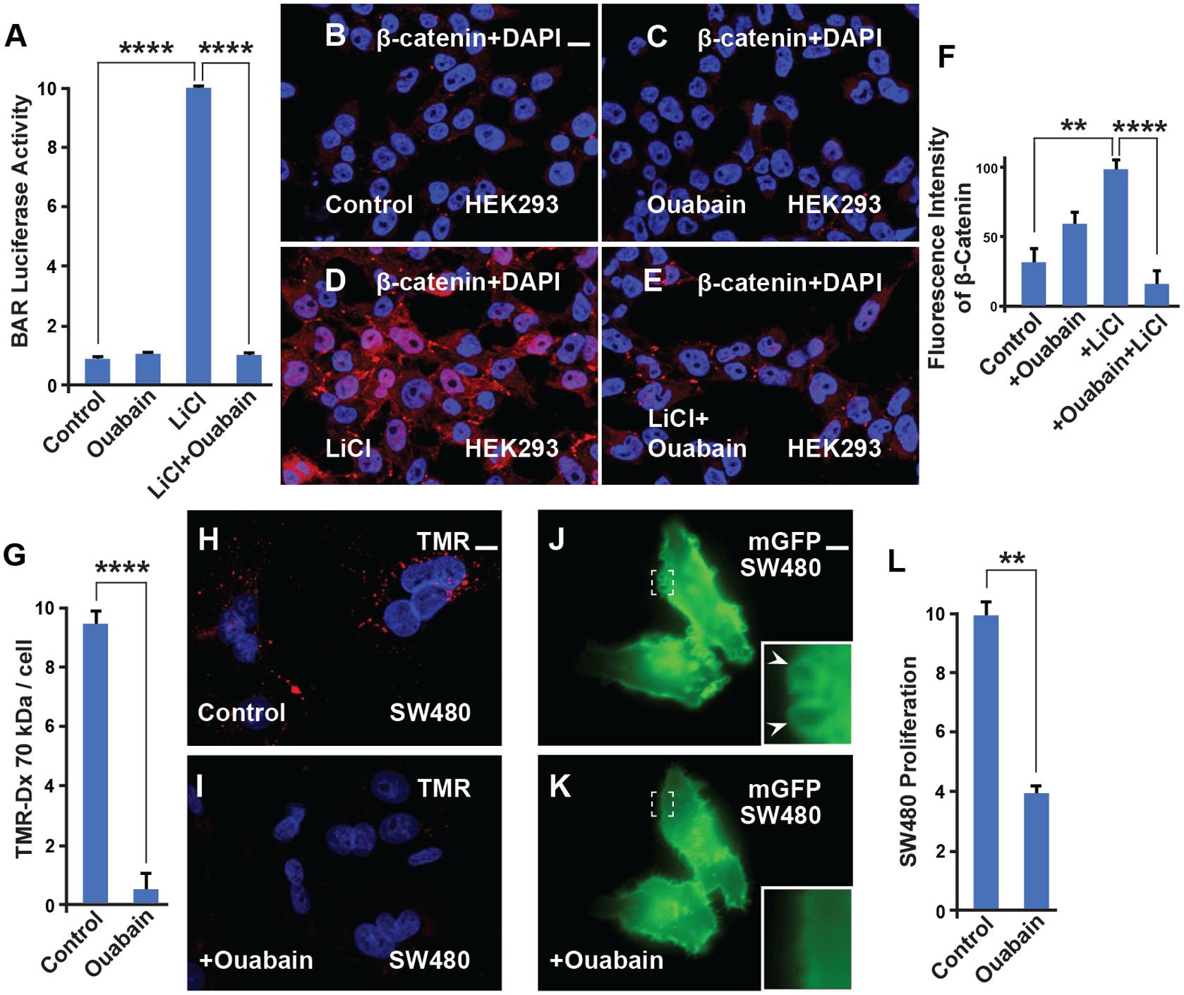 Fig. 3.Ouabain inhibits β-catenin signaling, macropinocytosis, and cell proliferation. (A) β-catenin transcriptional activity stimulated by Wnt3a was strongly inhibited by Ouabain in HEK293BR cells. (B) Untreated HEK293BR (BAR/Renilla) cells stained with total β-catenin antibody. (C) HEK293BR (BAR/Renilla) cells treated with Ouabain showed no changes in β-catenin levels. (D) LiCl (40 mM) activates the β-catenin transcriptional response as shown in the BAR-luciferase assay. This effect was blocked with Ouabain (1 µM) treatment. (E) The increase of β-catenin levels due to LiCl, which increases macropinocytosis (Albrecht et al., 2020), was blocked by Ouabain. (F) Quantification of the β-catenin levels from B and E. (G) Quantification of the macropinocytosis uptake of TMR-dextran 70 kDa into SW480 cells and its reduction by Ouabain treatment. (H) TMR-dextran 1 (1 mg/ml) uptake into SW480 cells after 1 h of incubation. (I) TMR-dextran uptake after 1 h of incubation is reduced with Ouabain (200 nM) treatment. (J-K) SW480 cells transfected with membrane-GFP display sustained macropinocytic vesicles (arrowhead and inset) that were rapidly blocked within 30 min of Ouabain treatment (still images from Movie 1). (L) Cell proliferation in SW480 cells is decreased by Ouabain treatment (200 nM), only viable cells were scored. All experiments with cultured cells were biological triplicates. Error bars denote SEM (n≥3) (**P<0.01, ****P<0.0001). Scale bar: 10 μm. |